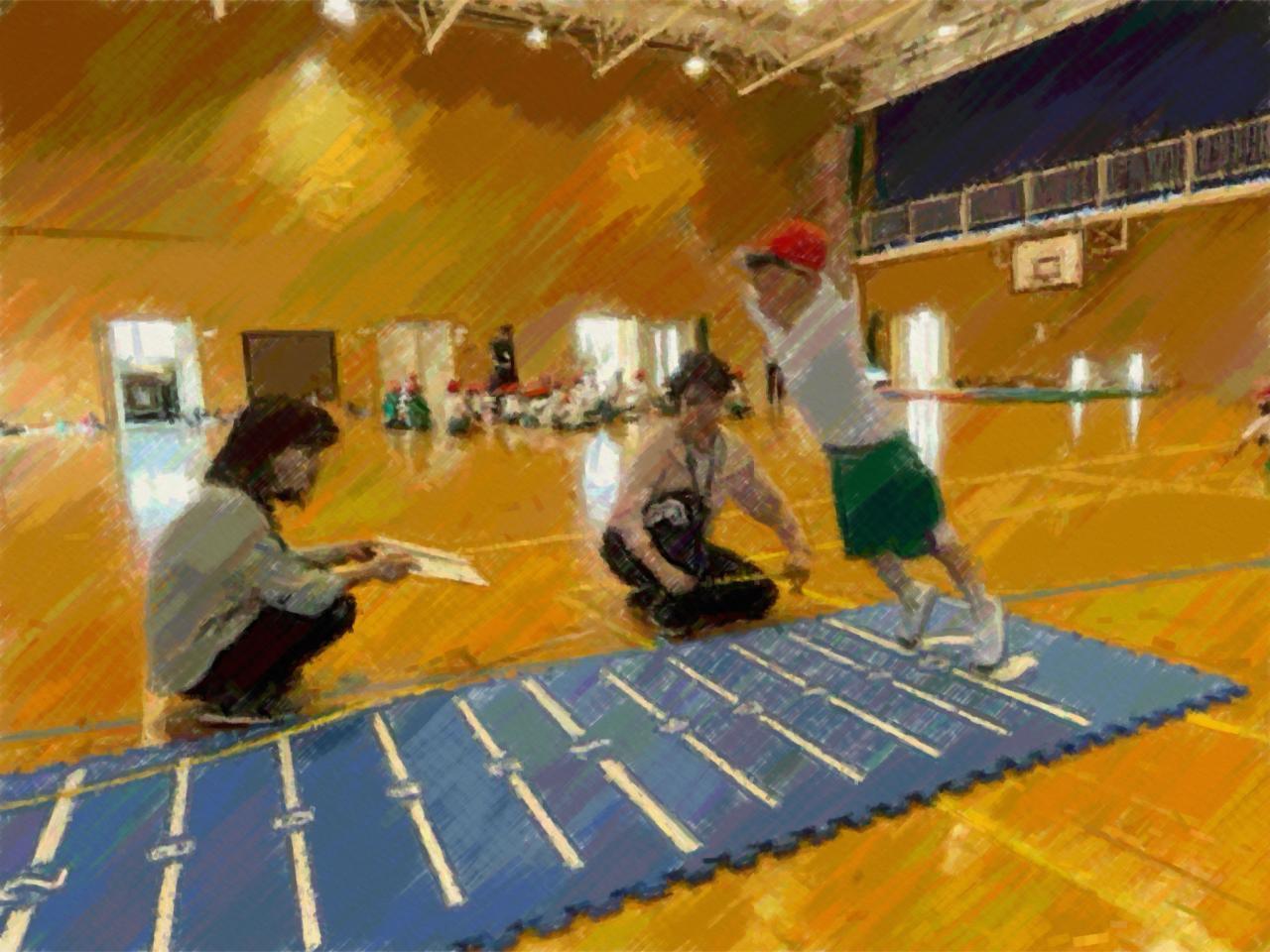 体育館では、跳躍力を測る「立ち幅跳び」や柔軟性を測る「長座体前屈」、敏捷性を測る反復横とびなどを行いました。