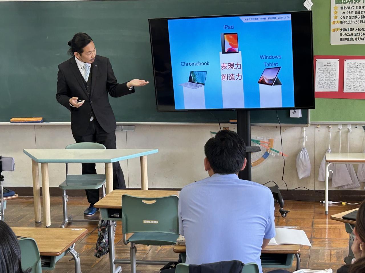 児童が主体的に学ぶ力を身についていくため、従来の「教師主体の教授・指示型授業」から「児童主体の協働的、個別最適な学びの授業」に変えていく必要性、そしてその手立てについて講話くださいました。そして深い学びを誘うには、タブレットを積極的に学習活動に活用しなければならないとして、既存のアプリを使った学習活動を紹介していただき、演習を行いました。