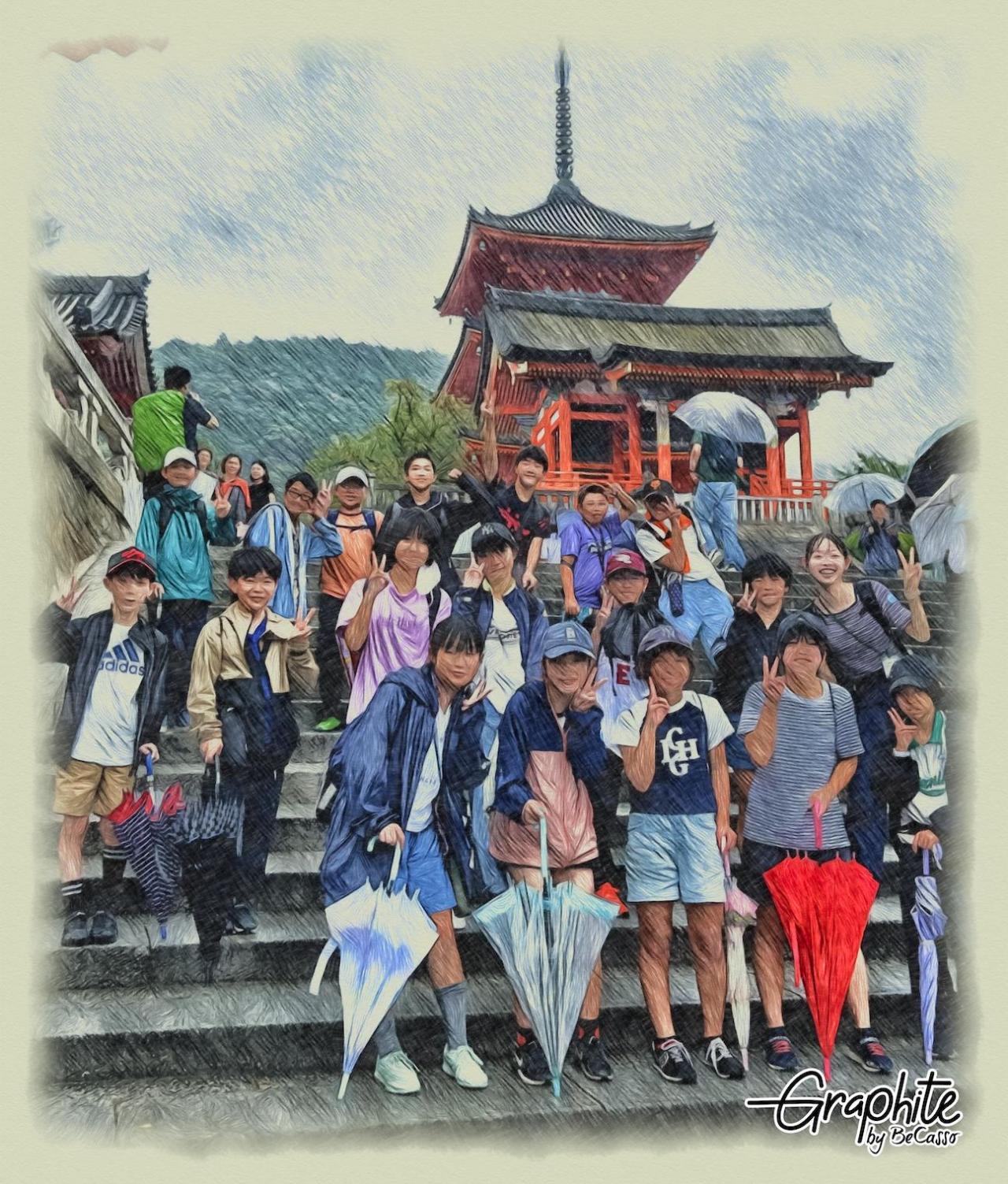 そして最初の目的地、清水寺へ。舞台からの眺めと高さを堪能するなど、班で境内を見学したあとは参道でお買い物。雨の上に混雑していて移動に時間がかかりました。