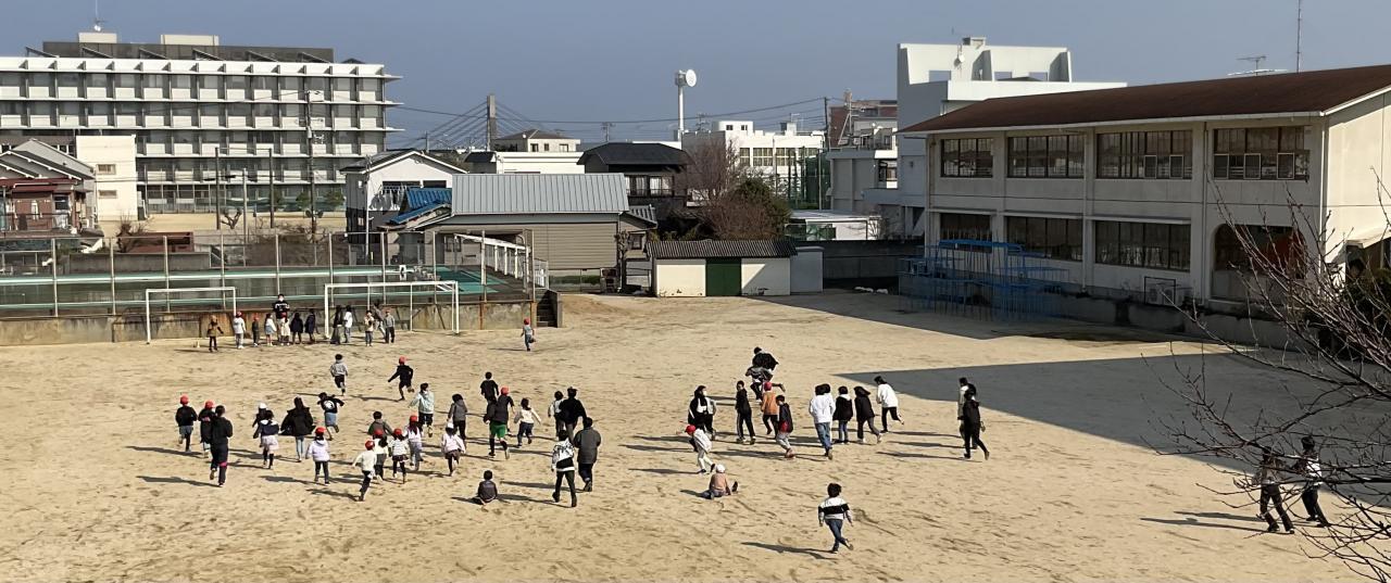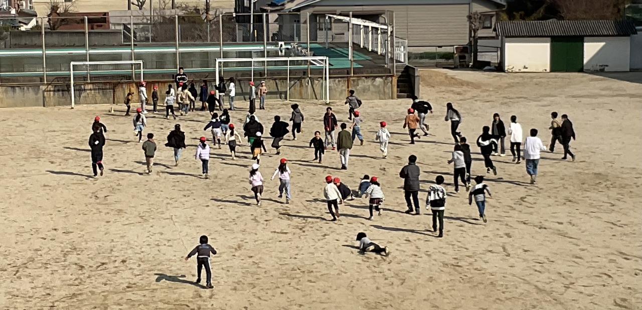 昼休み、運動場に出てきたみんな。大人数での「ダルマさんがころんだ」が始まりました。