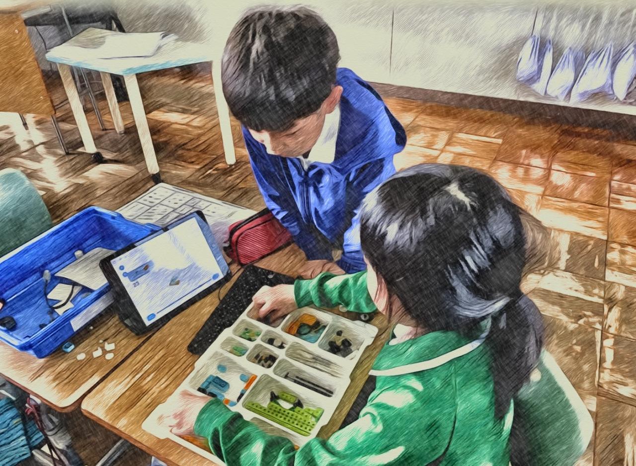 今日は教頭先生とプログラミング。ブロックを組み立て、タブレットでプログラムを入力して動かします。