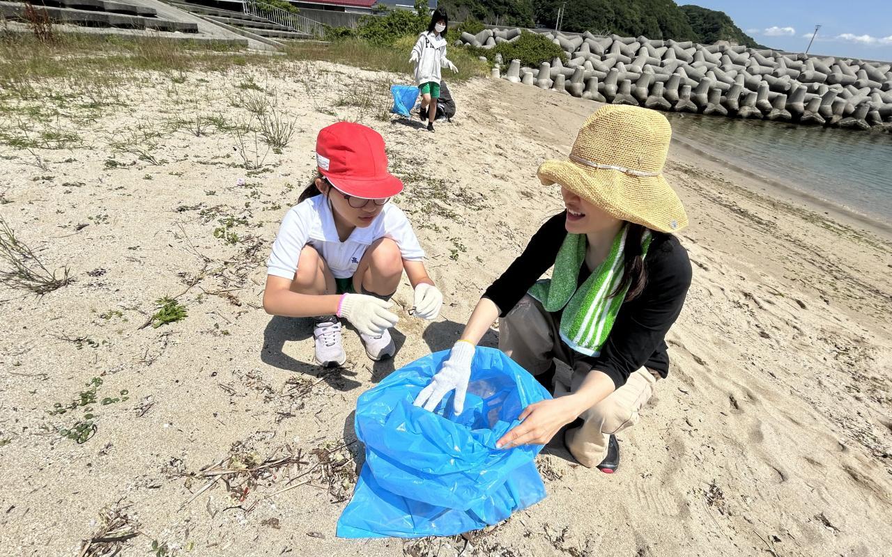 続いて、網を引く浜の掃除。漁協の方からプラスチック廃棄物の海洋汚染の話を聞いてから、いざ砂浜を見ると、本当に細かいプラスチックのゴミが多いことに気づきました。2050年には海洋のプラスチックごみの量が魚の量を上回るとも言われていることを身近な問題としてとらえることができたのではないかな。