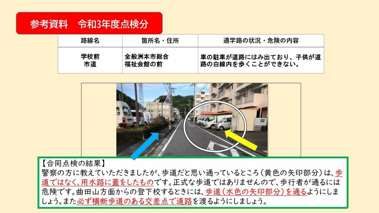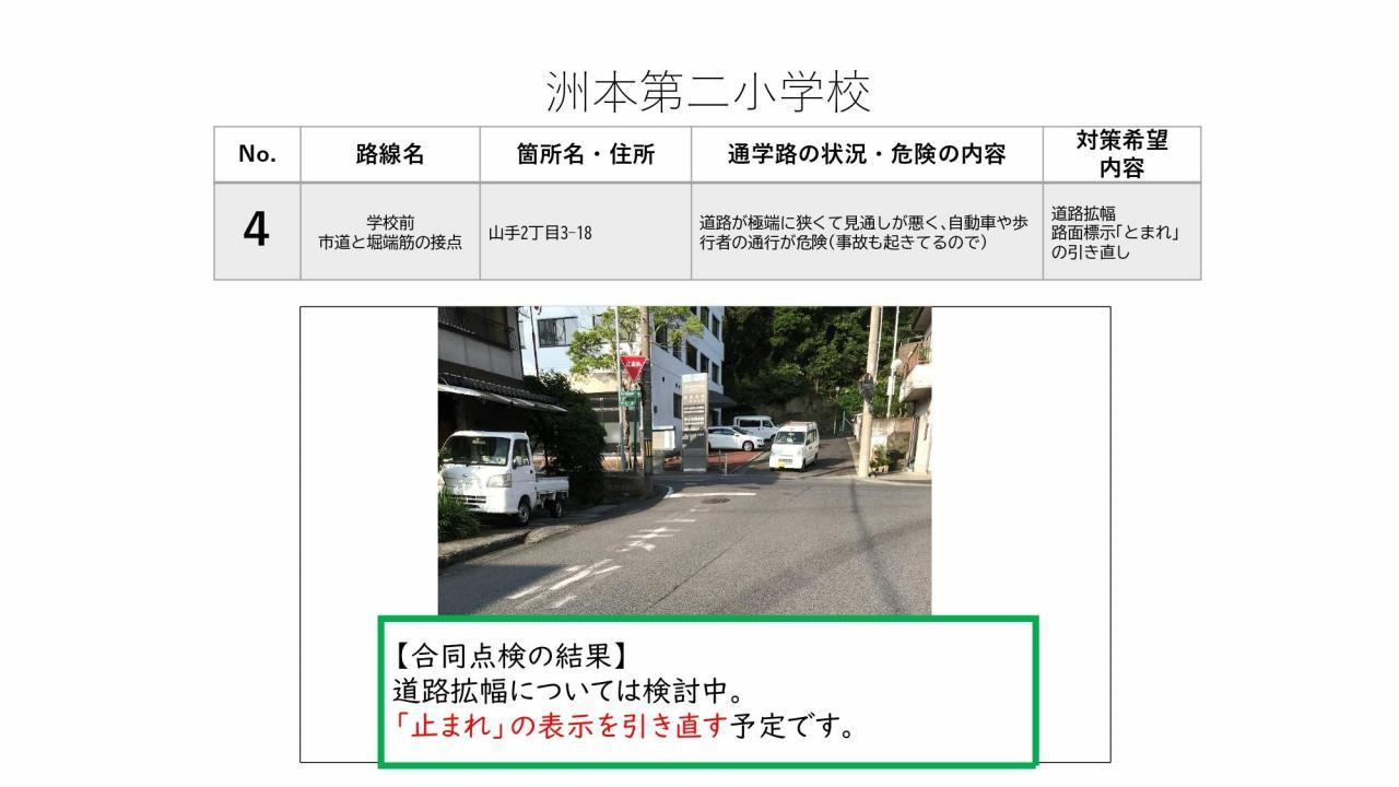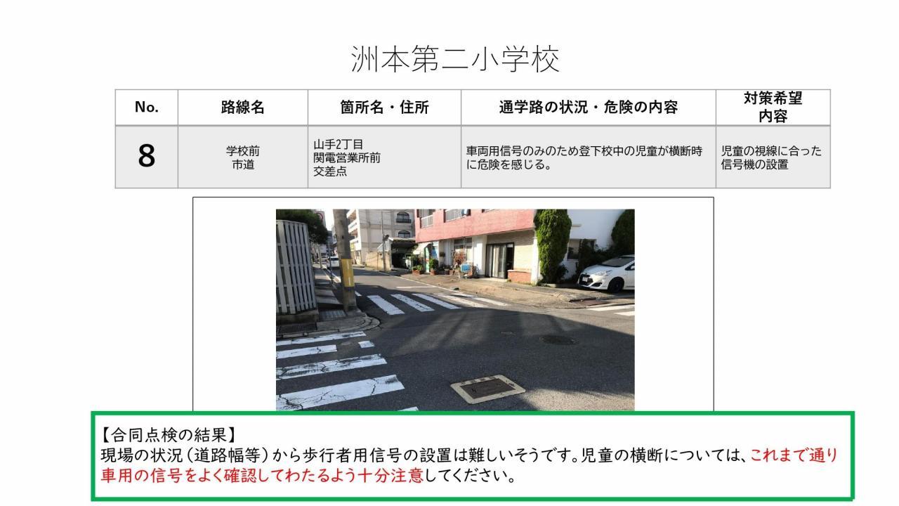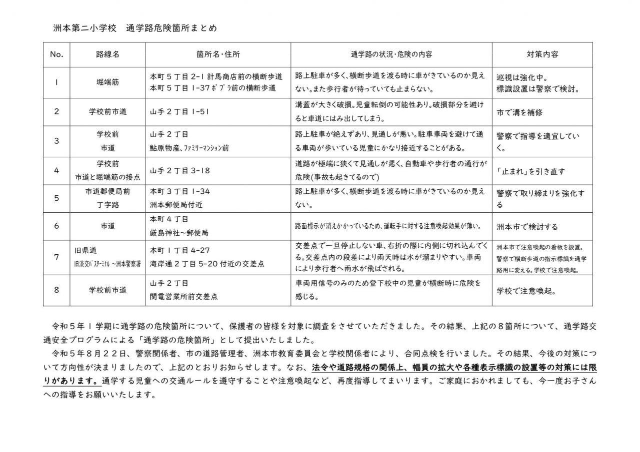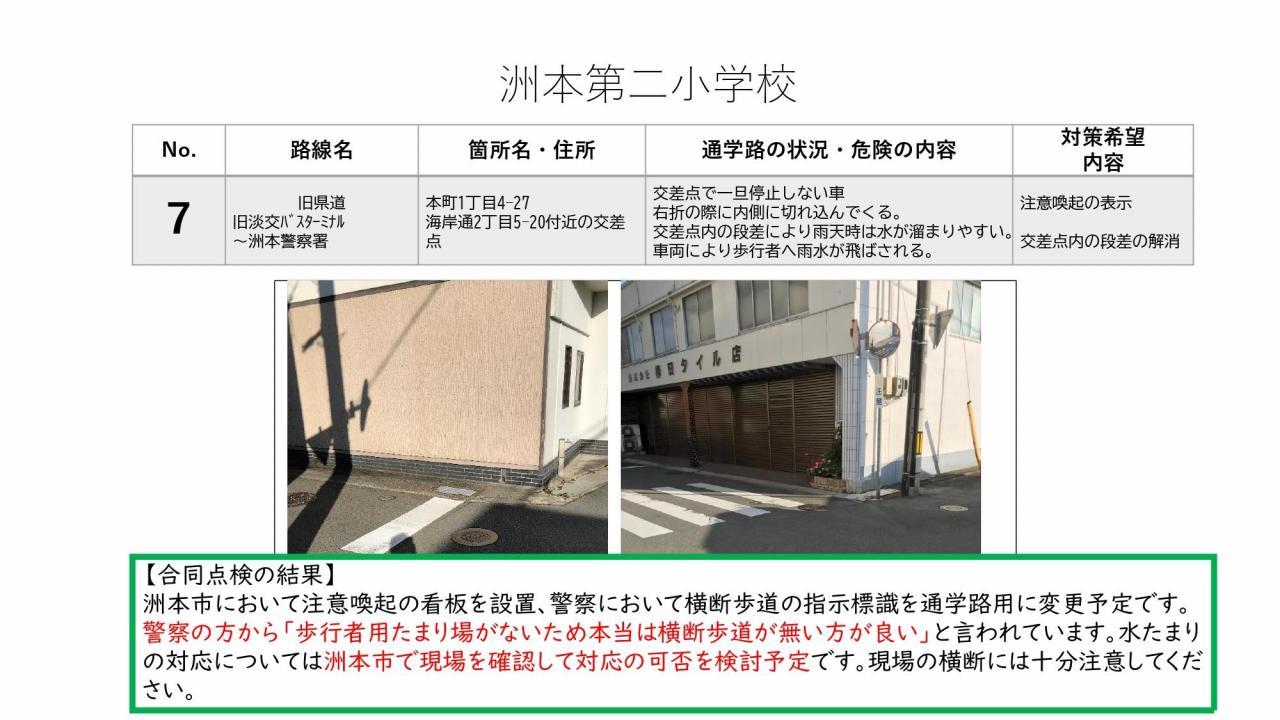 通学路合同点検の結果をお知らせいたします。この合同点検は、洲本市通学路交通安全プログラムで定められた、2年に1度実施されるものです。1学期に保護者の皆様からご意見を頂戴し、本校からは8カ所対策希望箇所を挙げておりました。道路管理を担当されている洲本市、また警察(公安委員会)それぞれでき得る限りの対策を検討・実施していただく予定です。