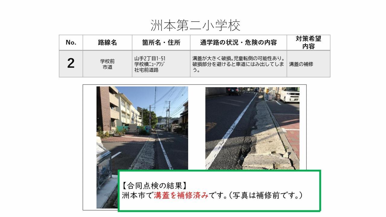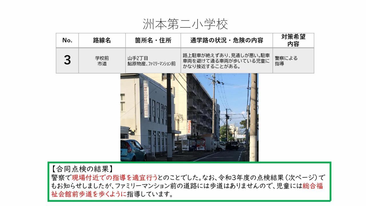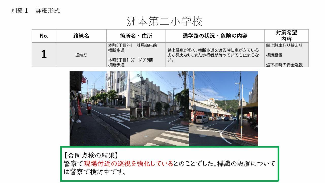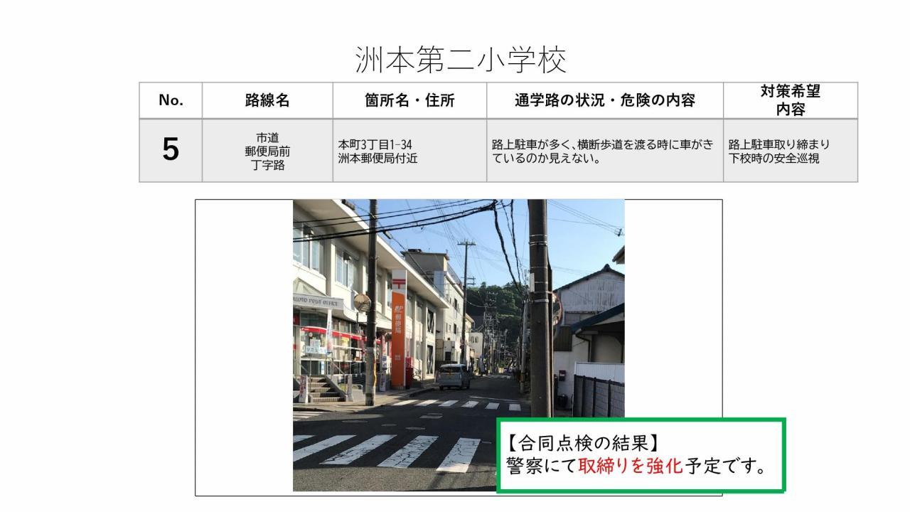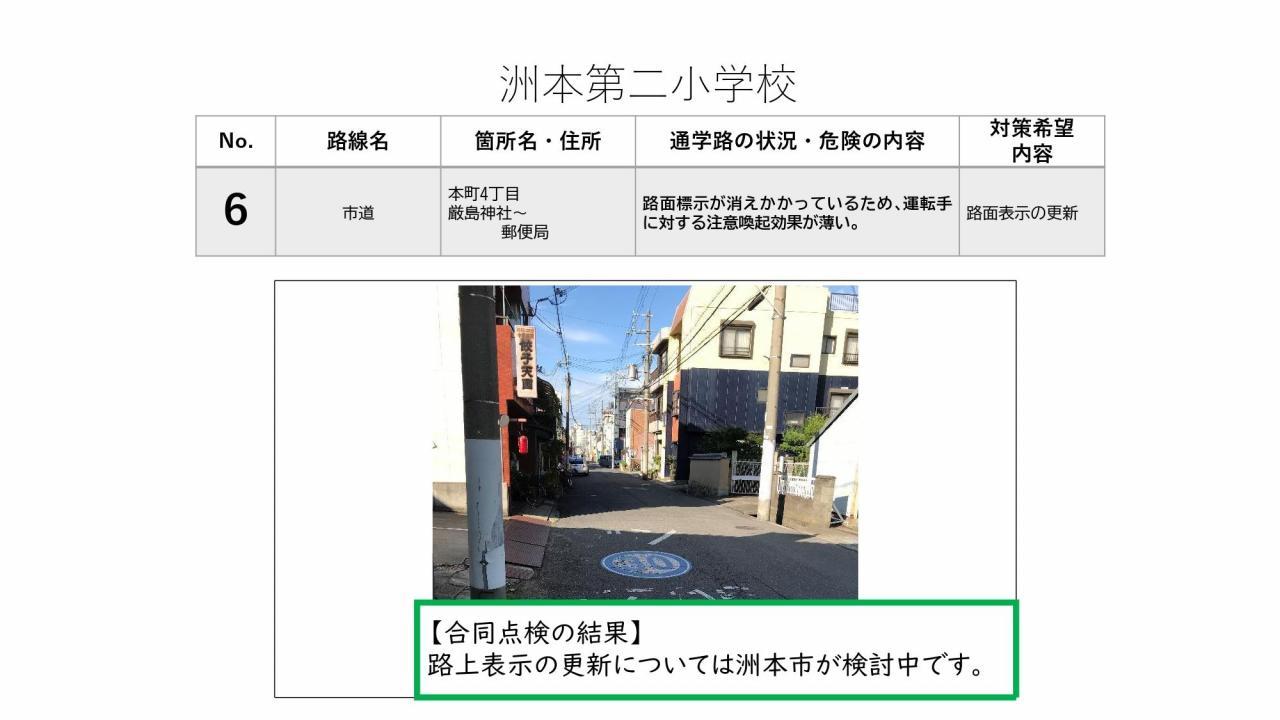 通学路合同点検の結果をお知らせいたします。この合同点検は、洲本市通学路交通安全プログラムで定められた、2年に1度実施されるものです。1学期に保護者の皆様からご意見を頂戴し、本校からは8カ所対策希望箇所を挙げておりました。道路管理を担当されている洲本市、また警察(公安委員会)それぞれでき得る限りの対策を検討・実施していただく予定です。