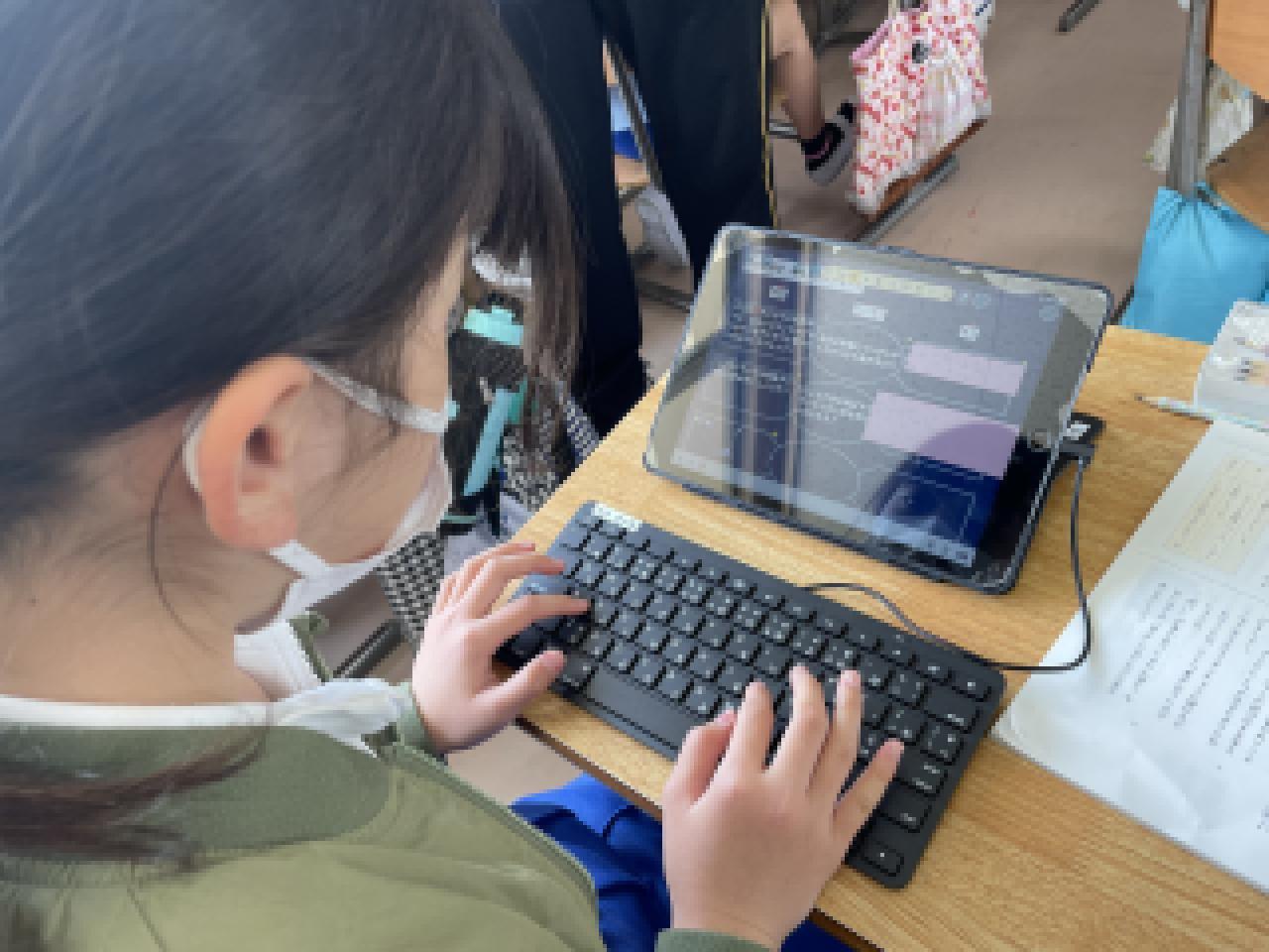 タブレットは、手書き入力も音声入力もできるので、各児童が使いやすく、また、その場に応じた方法で文字入力をしています。すでにローマ字をマスターした4年生は、キーボード入力も始めています。片手でキーボードを打ちながら、もう一方の片手で画面を触って操作する人もいるほど。
