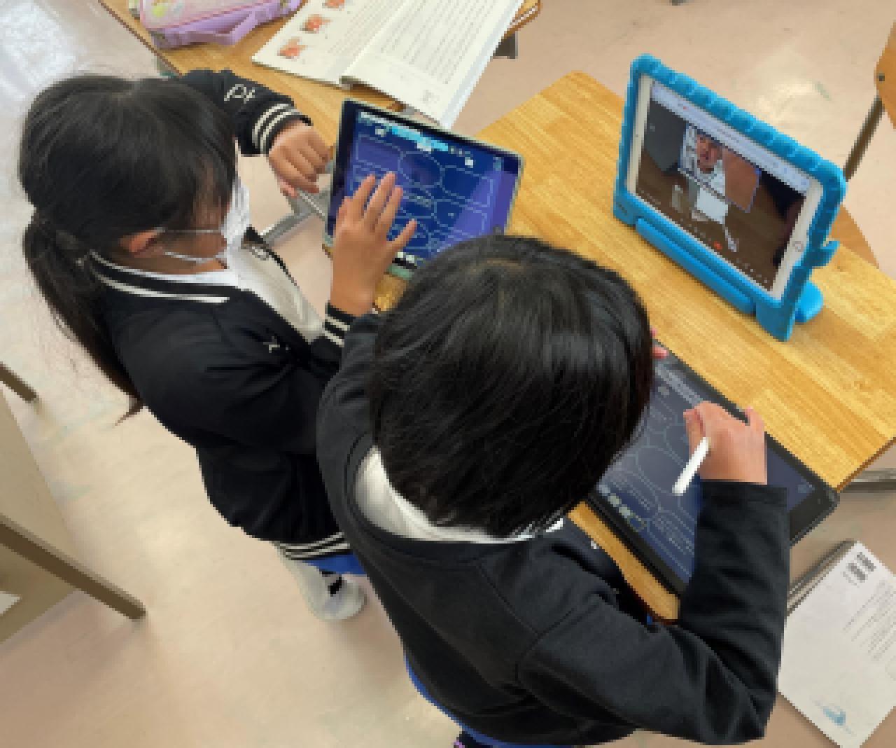 中学年以上になると、自分の考えをタブレットに入力し、順番を変えたり、構成を考えたり、資料をリンクさせたりしながら、効率よく学習を進めています。また、自分の考えを友達に説明する際も、画面を見せながら行ったり、離れているお友達とも情報の共有や交換にリモートアプリを使ったりしています。
