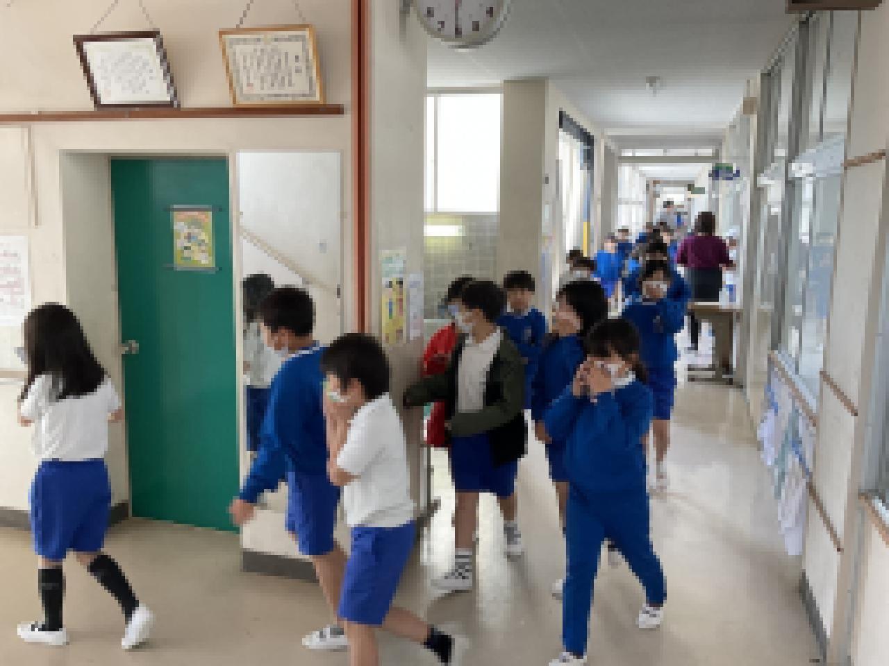 同じ避難でも、災害によって違うところがあるので、日ごろからそれぞれの動き方を訓練する必要があります。大野小学校では、普段の授業前後の移動にも、避難時の動きを取り入れながら安全確保の方法を身につけていきます。