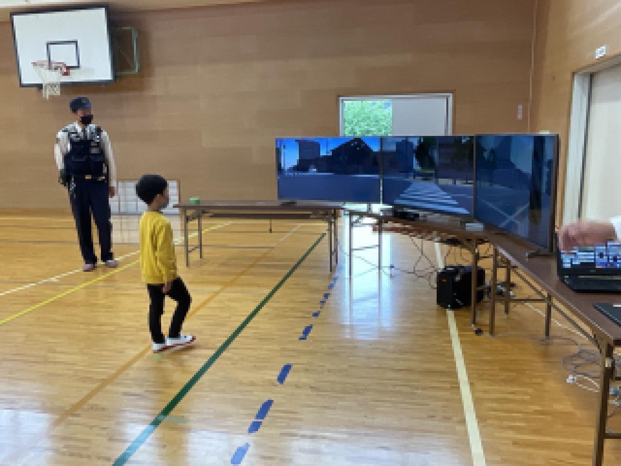 一年生だけ、歩行者シュミレーションで、バーチャルな体験。今日は雨だったのですが、本当に道を歩いているような感じ。時間の都合で一部の人ができなくて、ごめんね。