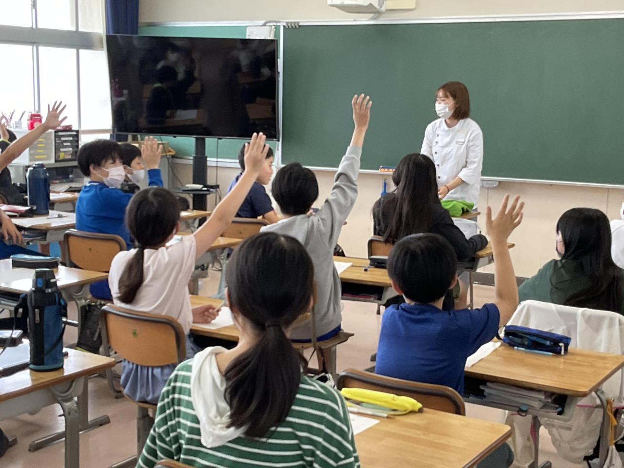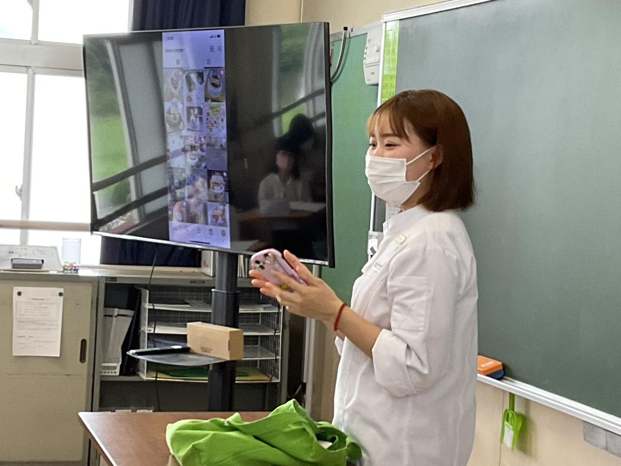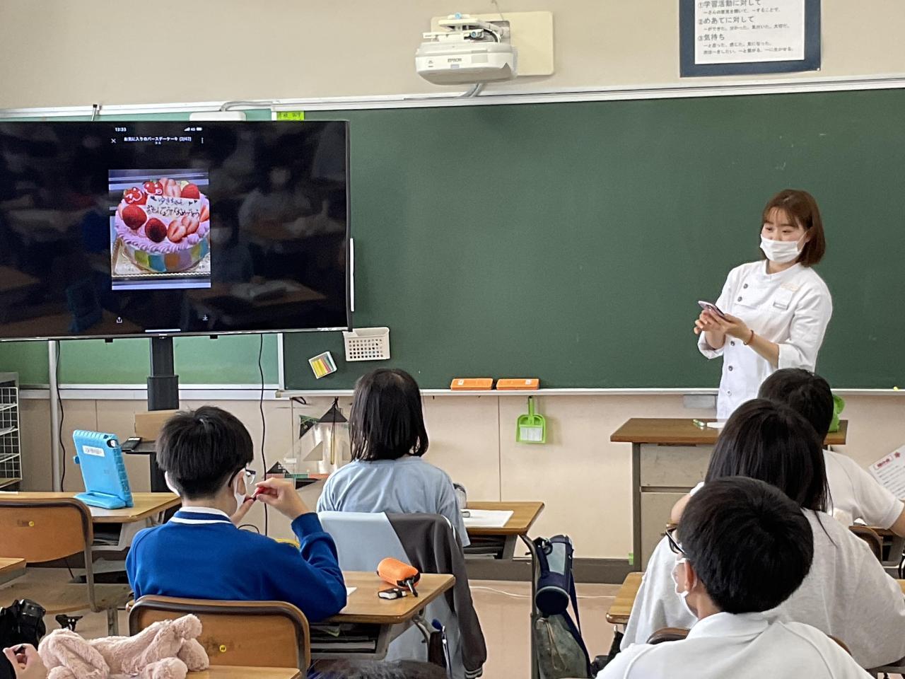 新村の「Dearコロン」のオーナー兼パティシェール、濱田さんは本校の卒業生。子どもたちにお話ししてくれませんか、とお願いしたところ、大野小学校のみんなのためなら、と開店の時間を遅らせてまで来てくださいました。