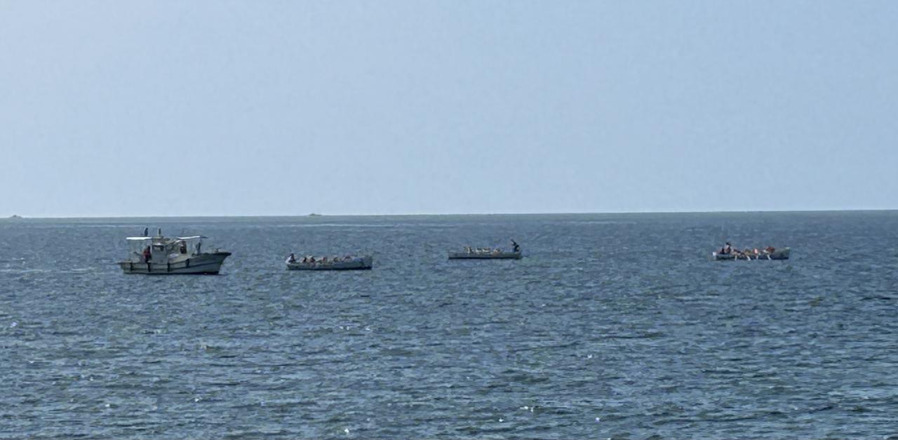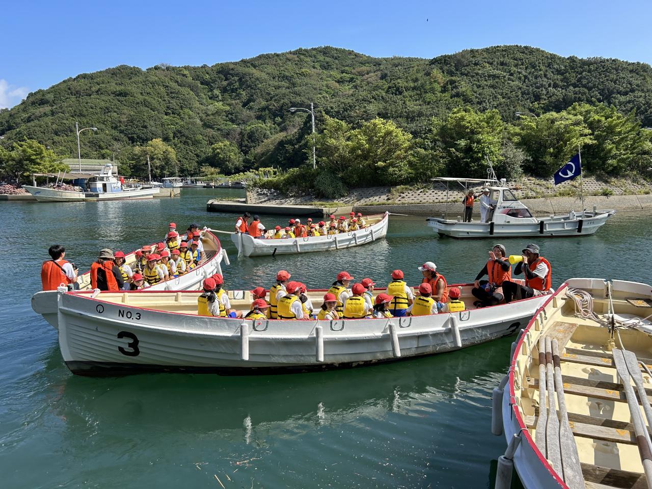 沖は潮の流れが速く、しかも櫂が重くて、はじめのうちは漕いでもなかなか進まないこともありましたが、最後はちゃんと港まで戻ってきました。