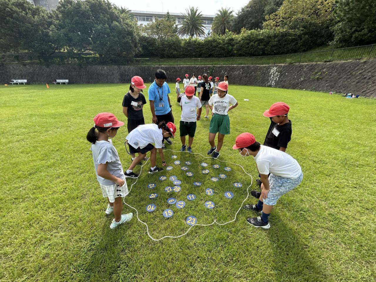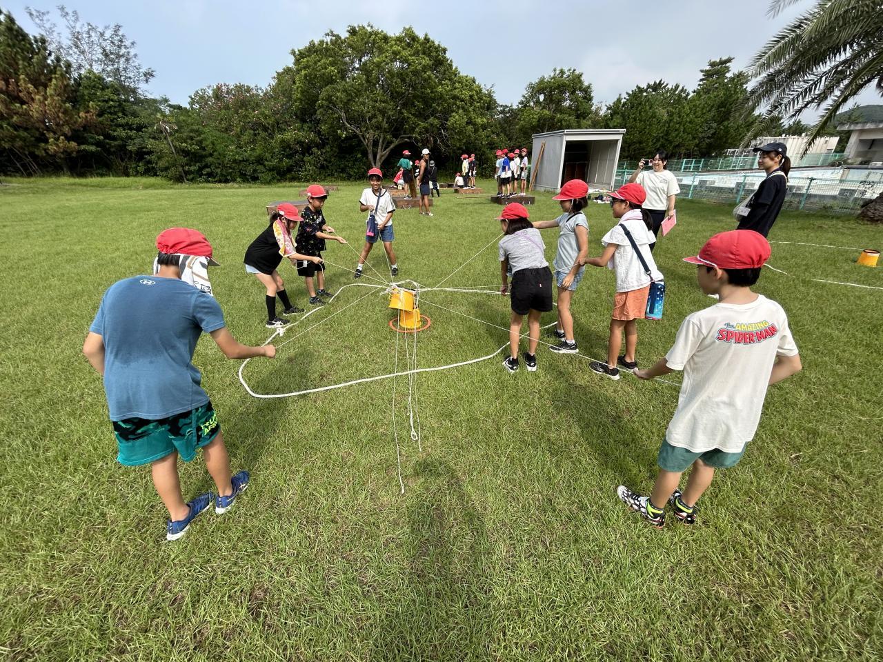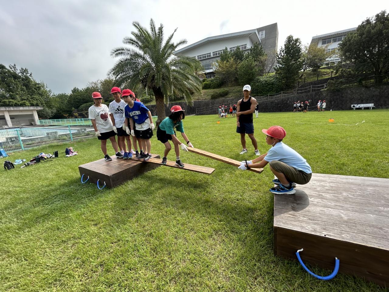 午前はアドベンチャーラリー。活動班ごとに3つの課題に挑戦しました。一つは「島わたし」2枚の板を地面につけずに渡して全員が次の島に移るというもの。