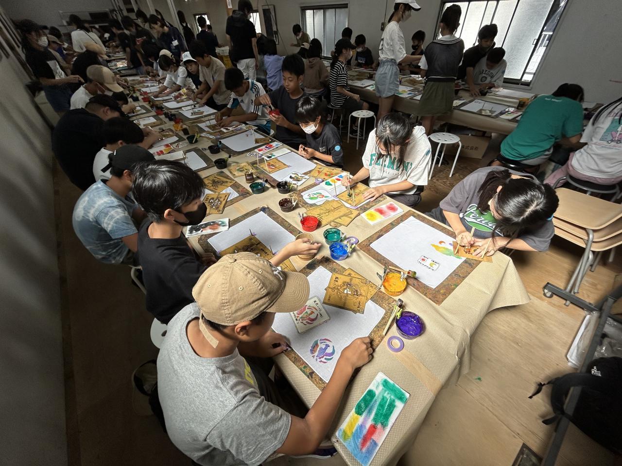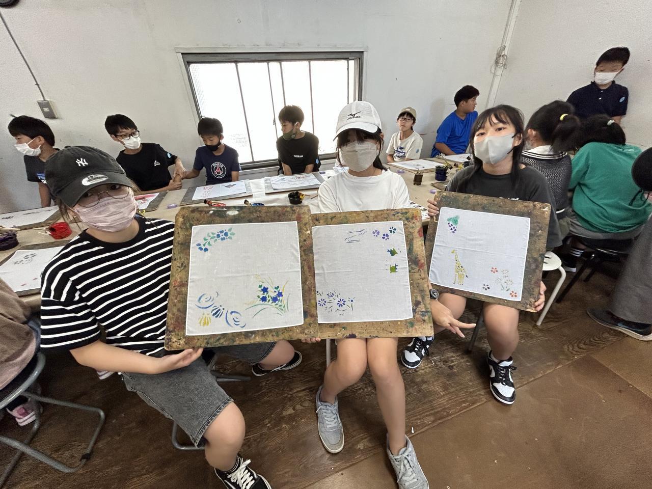 続いて京友禅染めの体験へ。どの人もステキなハンカチが出来上がりました。