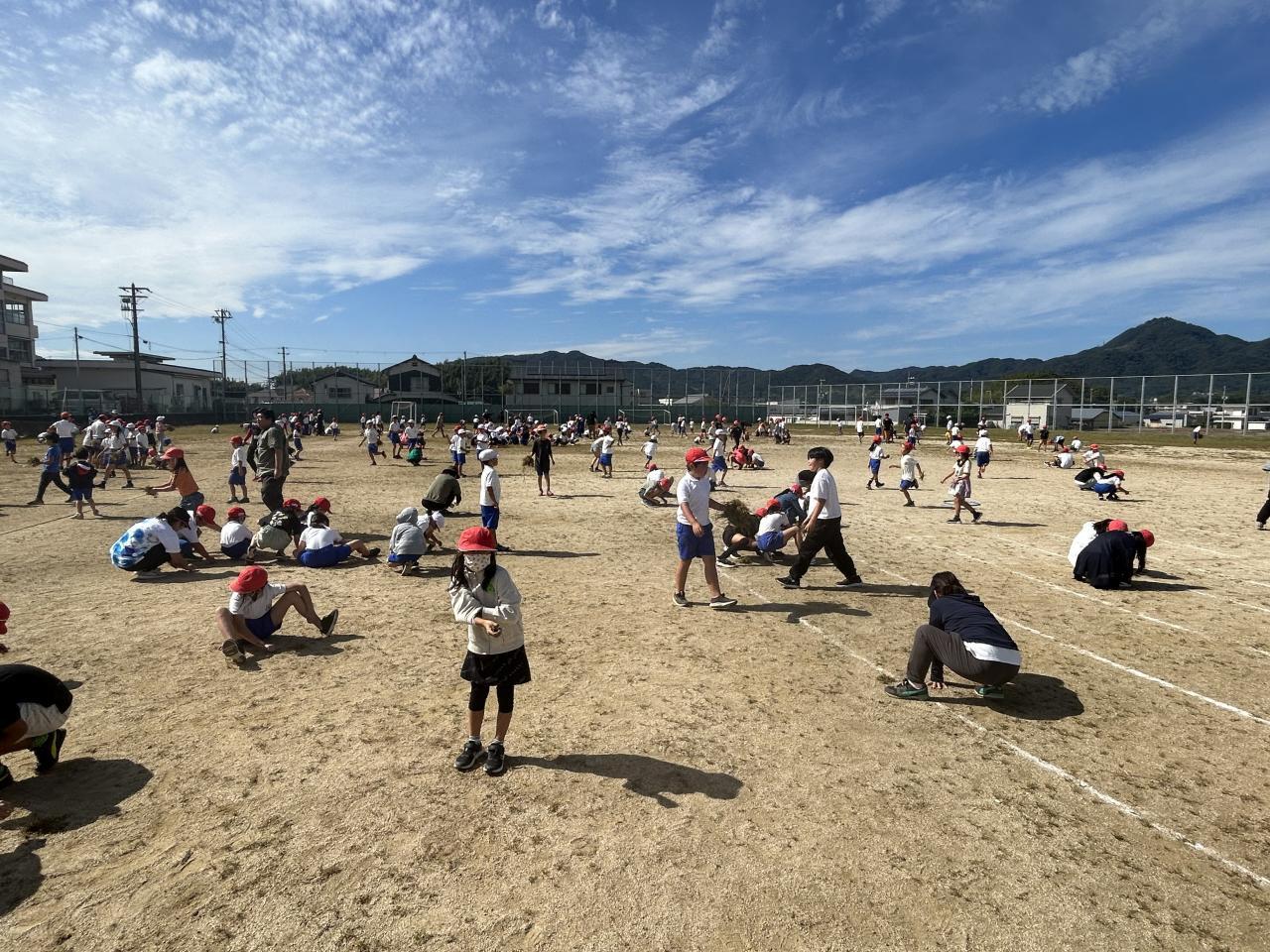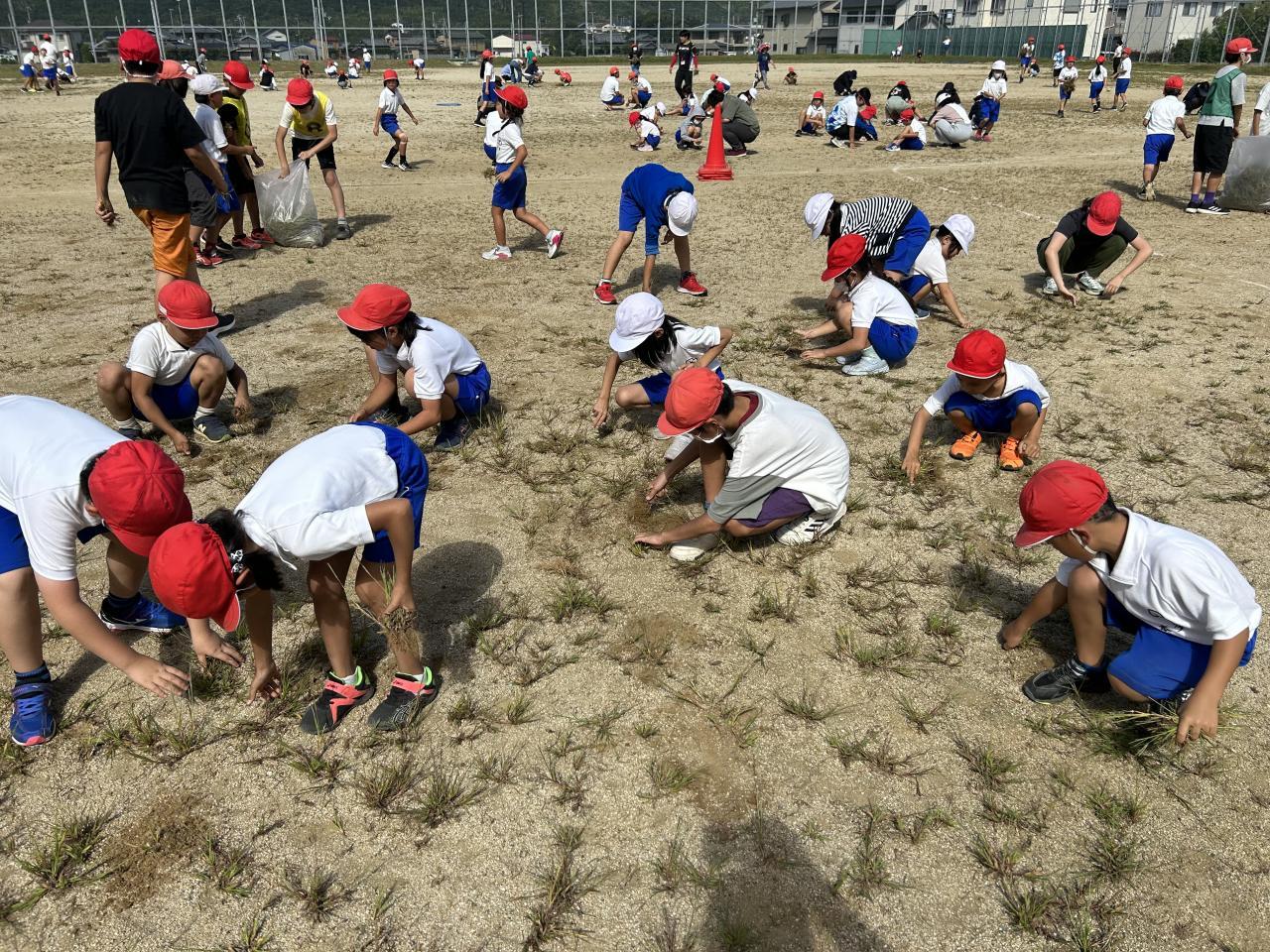続いて「草取り大会」に。運動場にいっぱいに茂った草。体育表現運動発表会に備え、練習中のケガにつながらないように、とのことで全校生を四つのチームに分け、量を競いました。
