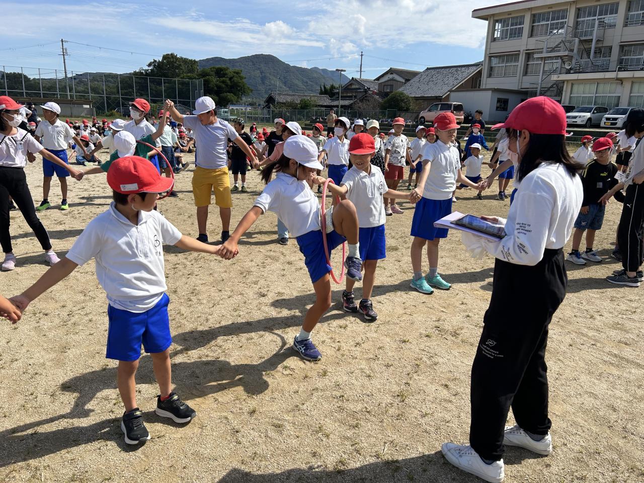 続いて縦割り集会に。今日のイベントは、手を繋いだメンバー全員の体をフラフープを通していく時間を競うゲーム。15班のみんなが1分16秒で優勝🏆しました。