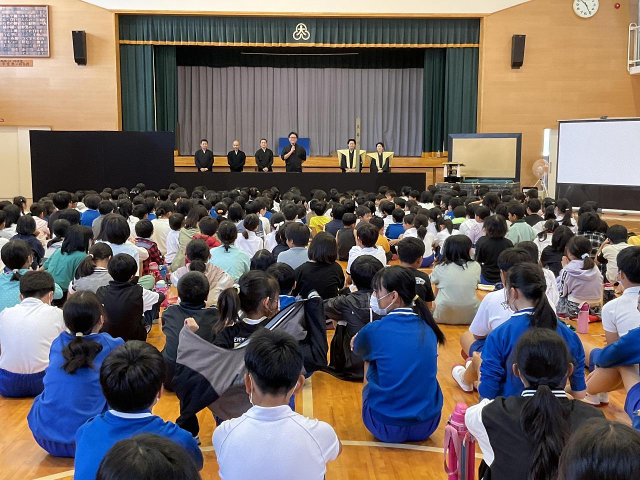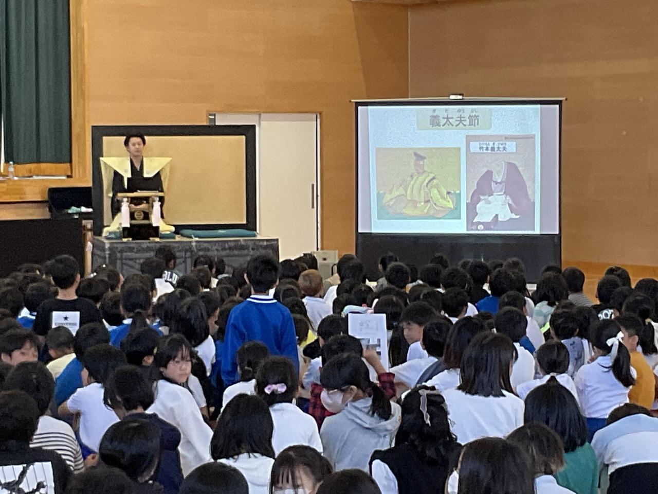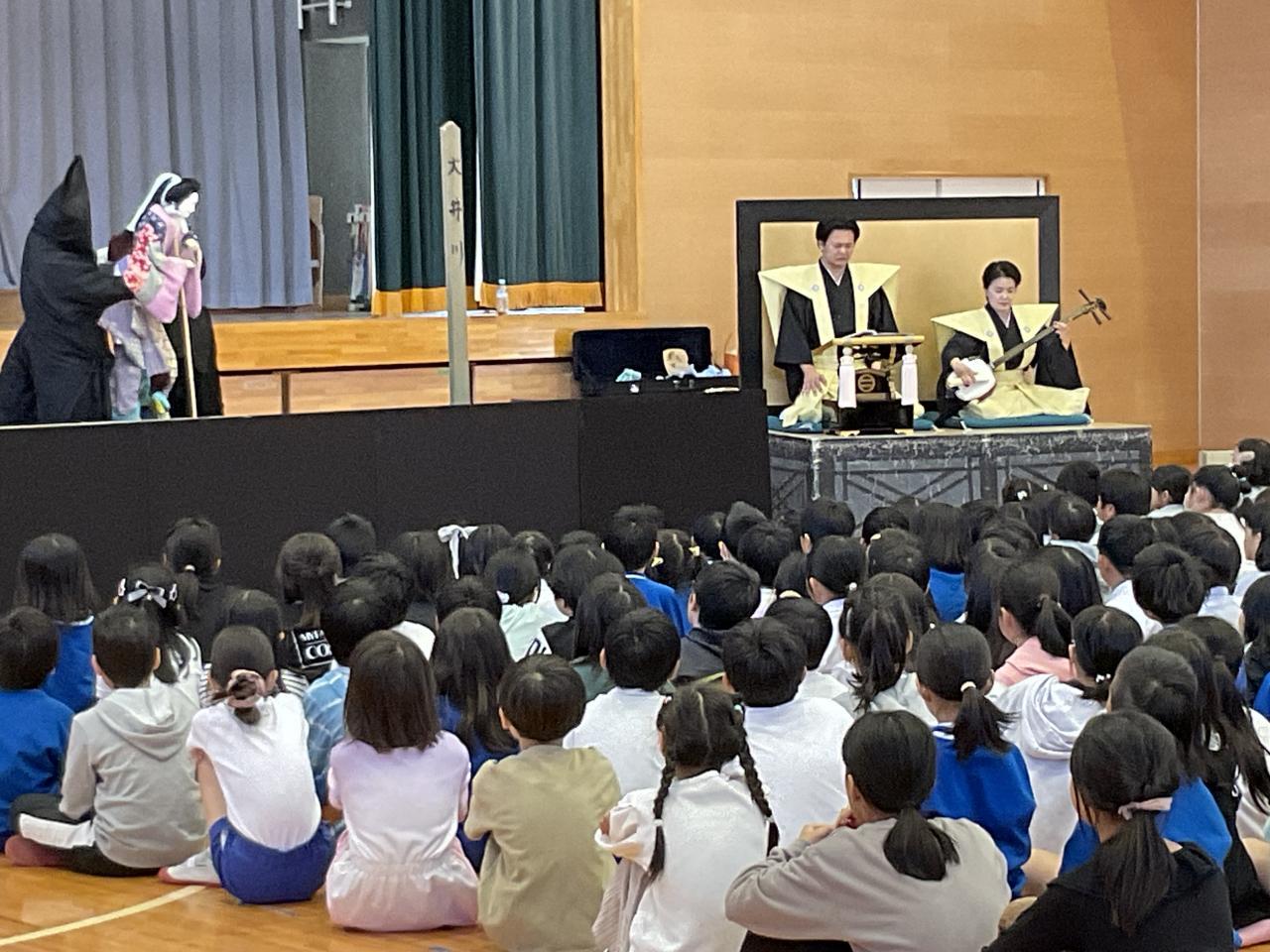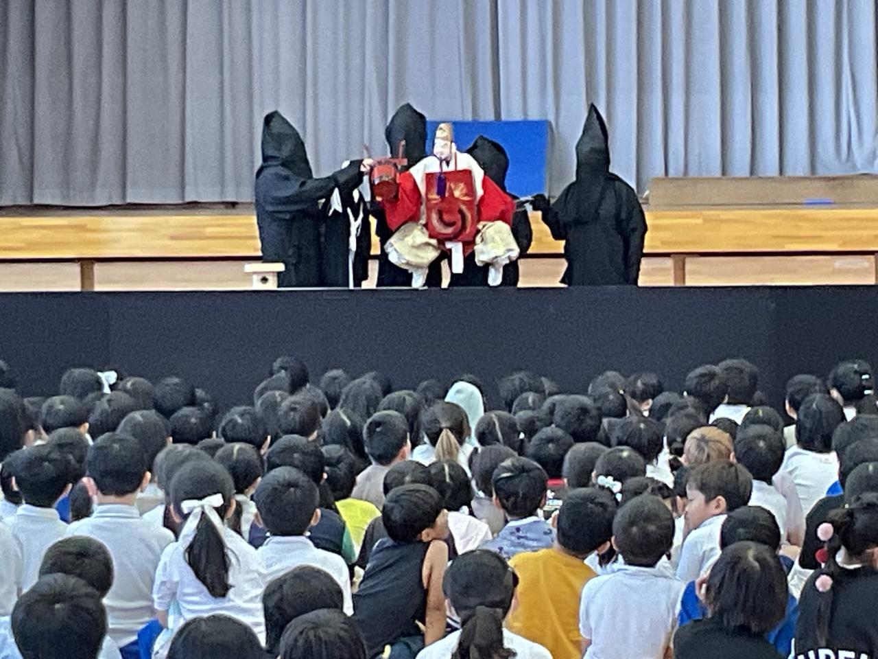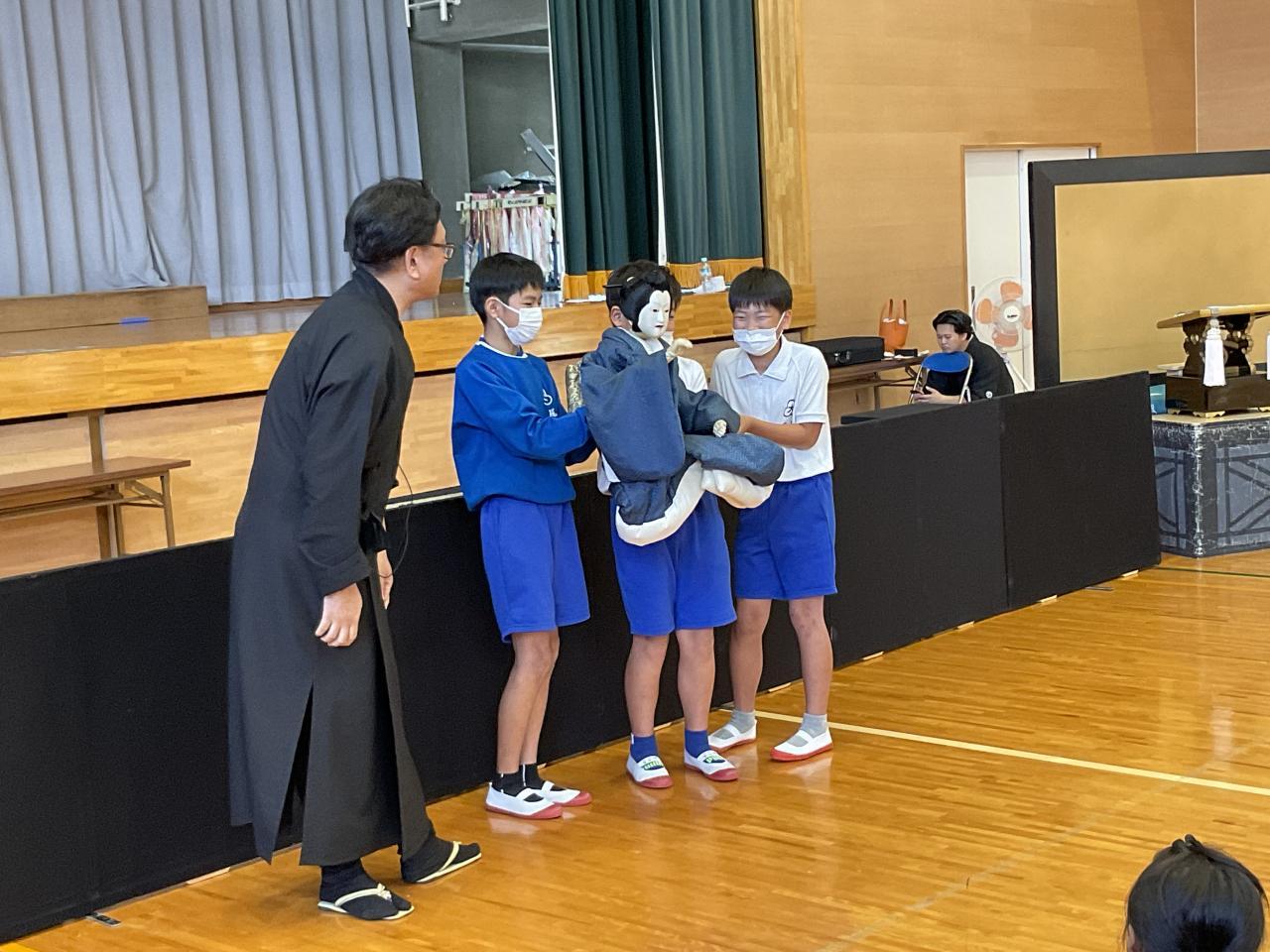 3-4校時は体育館で文化芸術鑑賞会。淡路人形座の方々にお越しいただきました。