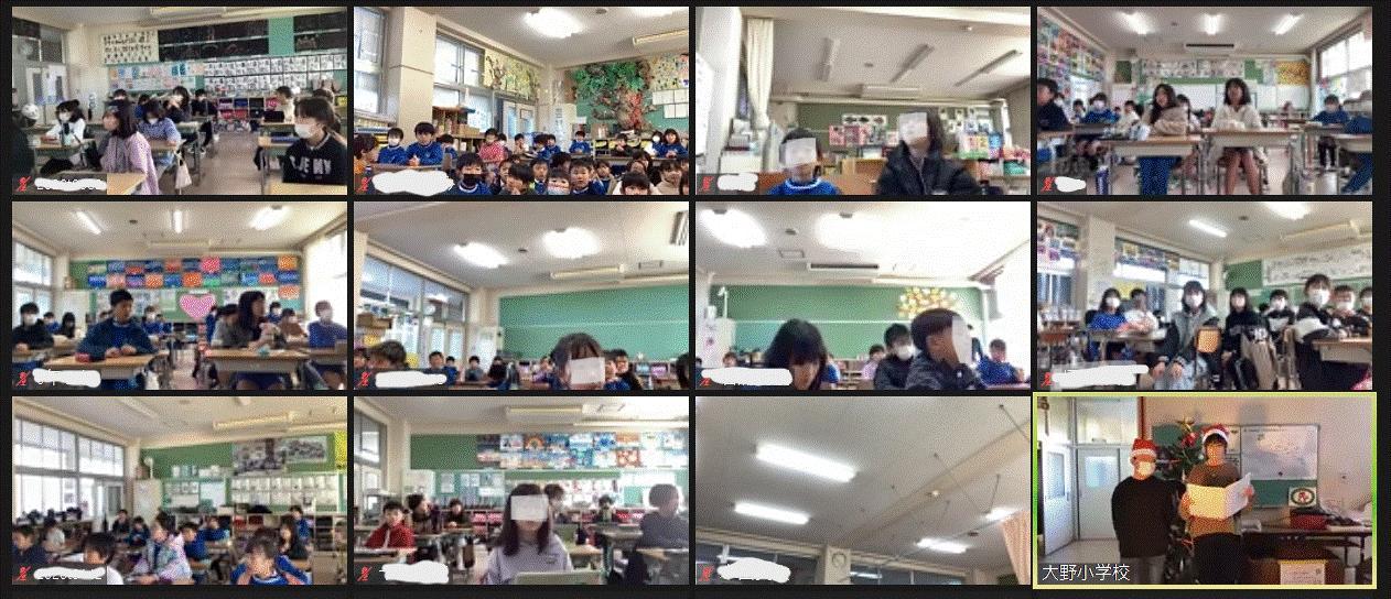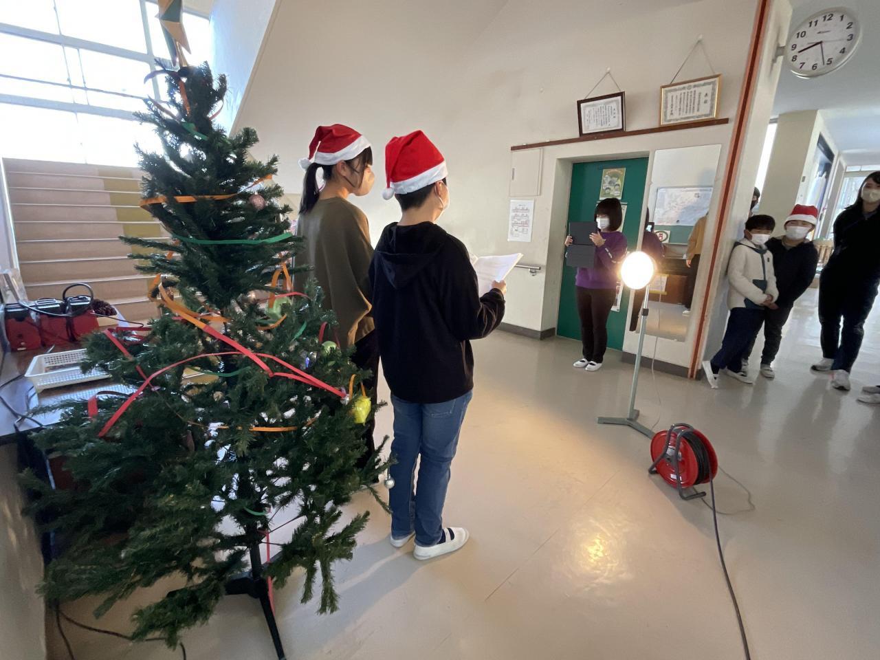 12月のオンライン集会のスタジオは職員室前で。あいにく3年生は学級閉鎖でお休みの寂しい今日ですが、児童運営委員会メンバーの進行で始まりました。