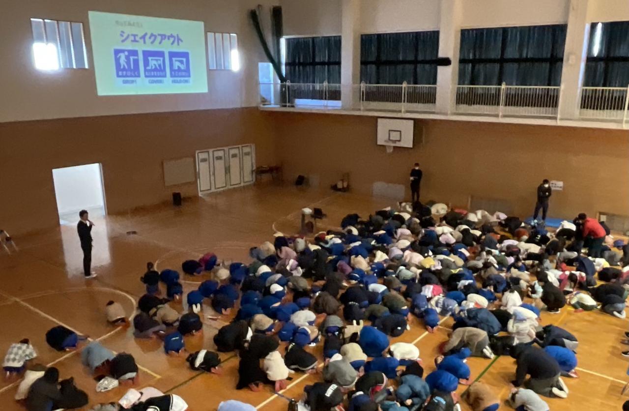 そして、シェイクアウト訓練。地震を感じた時にとる態勢の練習です。