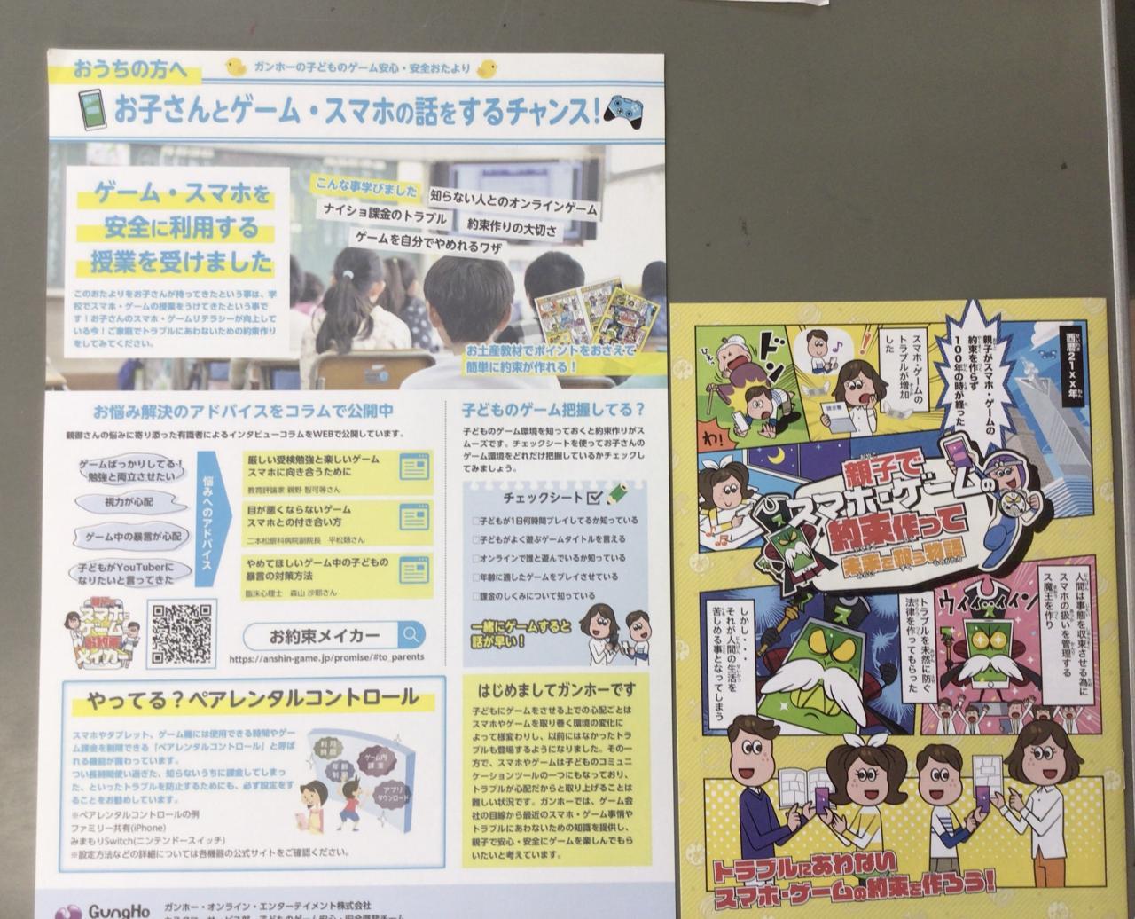 ガンホーさんからもらった手紙と冊子を2種類持ち帰っています。おうちの人と約束を作れる無料の「お約束メイカー」も手紙のQRコード読み取ってもらうと作成できるようです。ゲームの約束を見直す良い機会になればと思います。