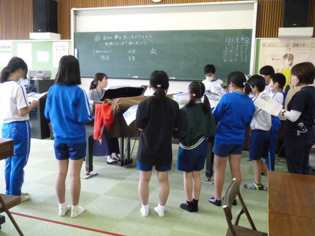今週5月22日~26日は、クラブ活動や委員会活動など、多様的な取組の1週間でした。特に、小中連携の観点から、安乎中学校の音楽担当教師が講師として、6年児童に合唱指導をしてくれました。歌を歌う前の準備体操・歌うポイントなど、子どもたちにわかりやすく説明してくれました。歌う楽しさを感じる機会でした。