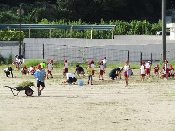 夏休みが過ぎ、遊ぶ子がいなかった運動場は草だらけとなりました。子どもたちには草引きボランティアをお願いしています。