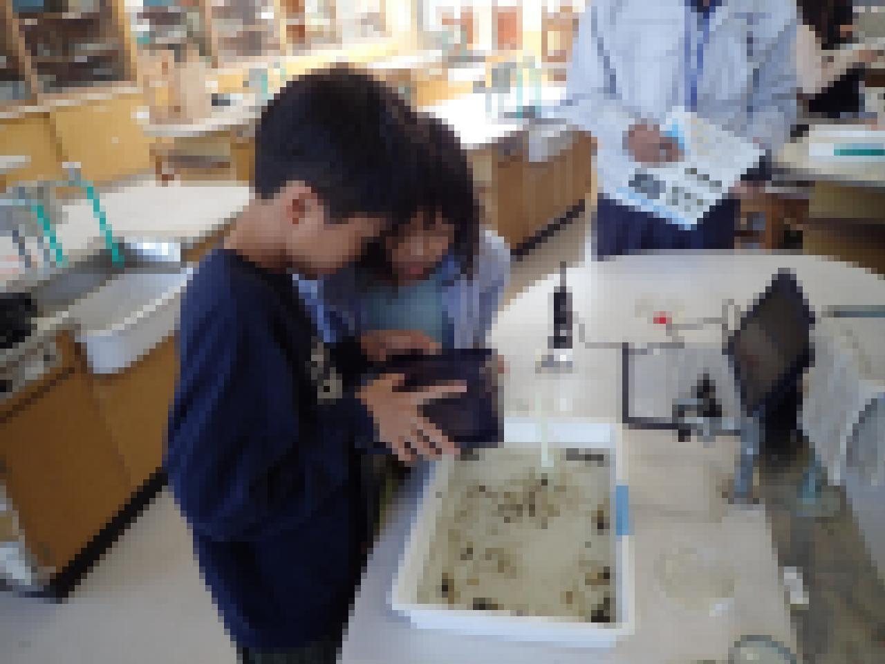 学校に帰ってから、採取した生き物を観察しました。虫眼鏡やマイクロスコープを使って、特徴をよく観察し、何という生き物なのか、調べていきました。