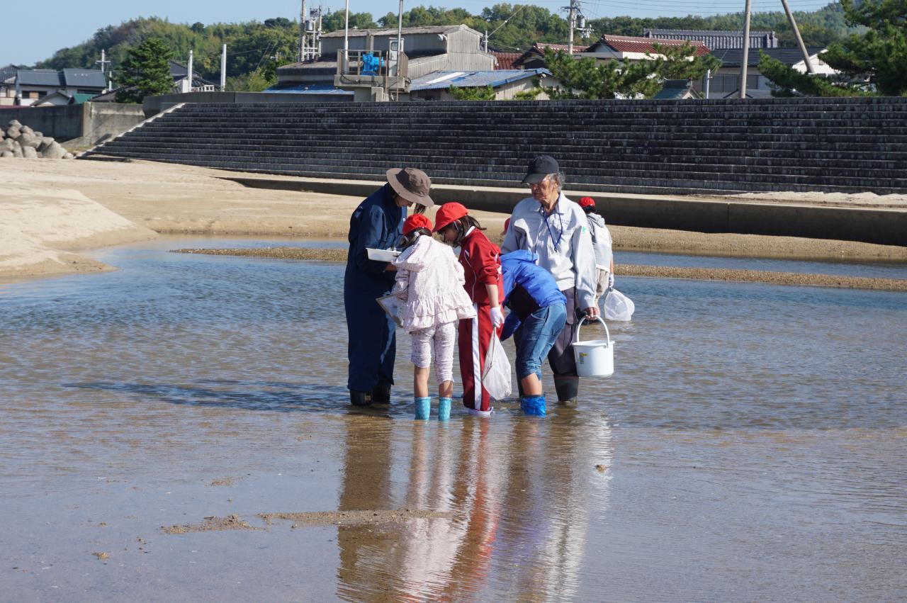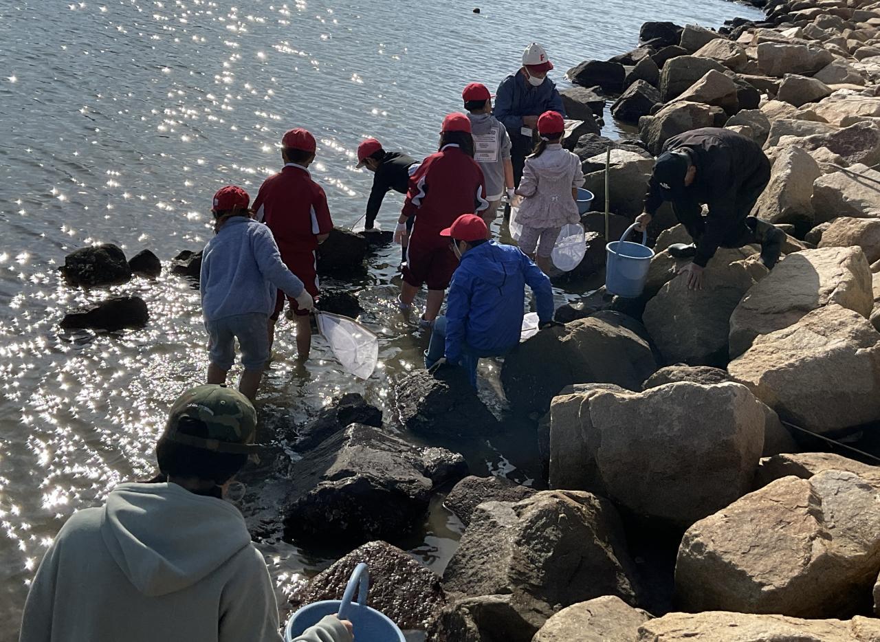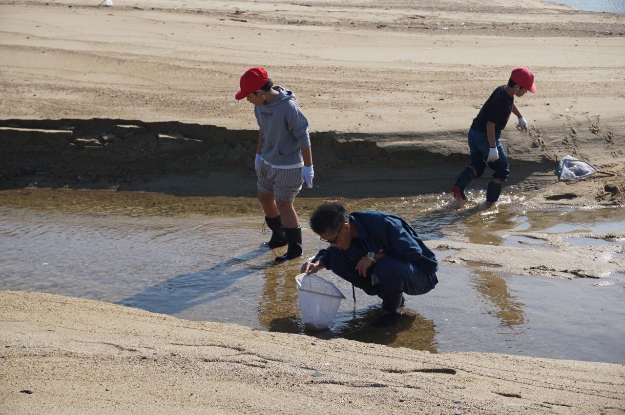 都志川の河口に生息する生物を調べました。つい2週間ほど前までは、気温が高く半袖の児童も多かったのですが、急に秋らしさ全開の季節感でしたが、水の中の生き物を根気よく、そして夢中になって追いかけていました。つい深みまで追いかけてしまい、長靴の中が水浸しになった子、ズボンがびしょぬれになった子もいましたが、元気よく活動できました。着替えの用意等、保護者の皆様にはご配慮いただき有難うございました。