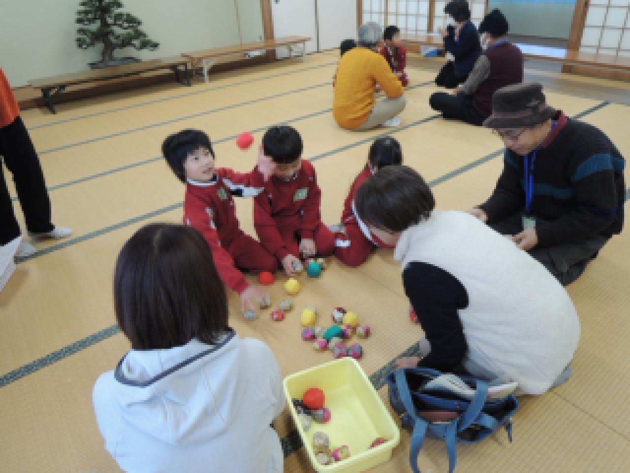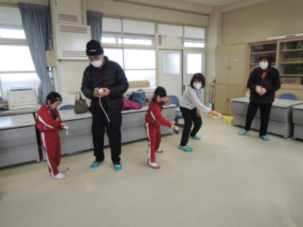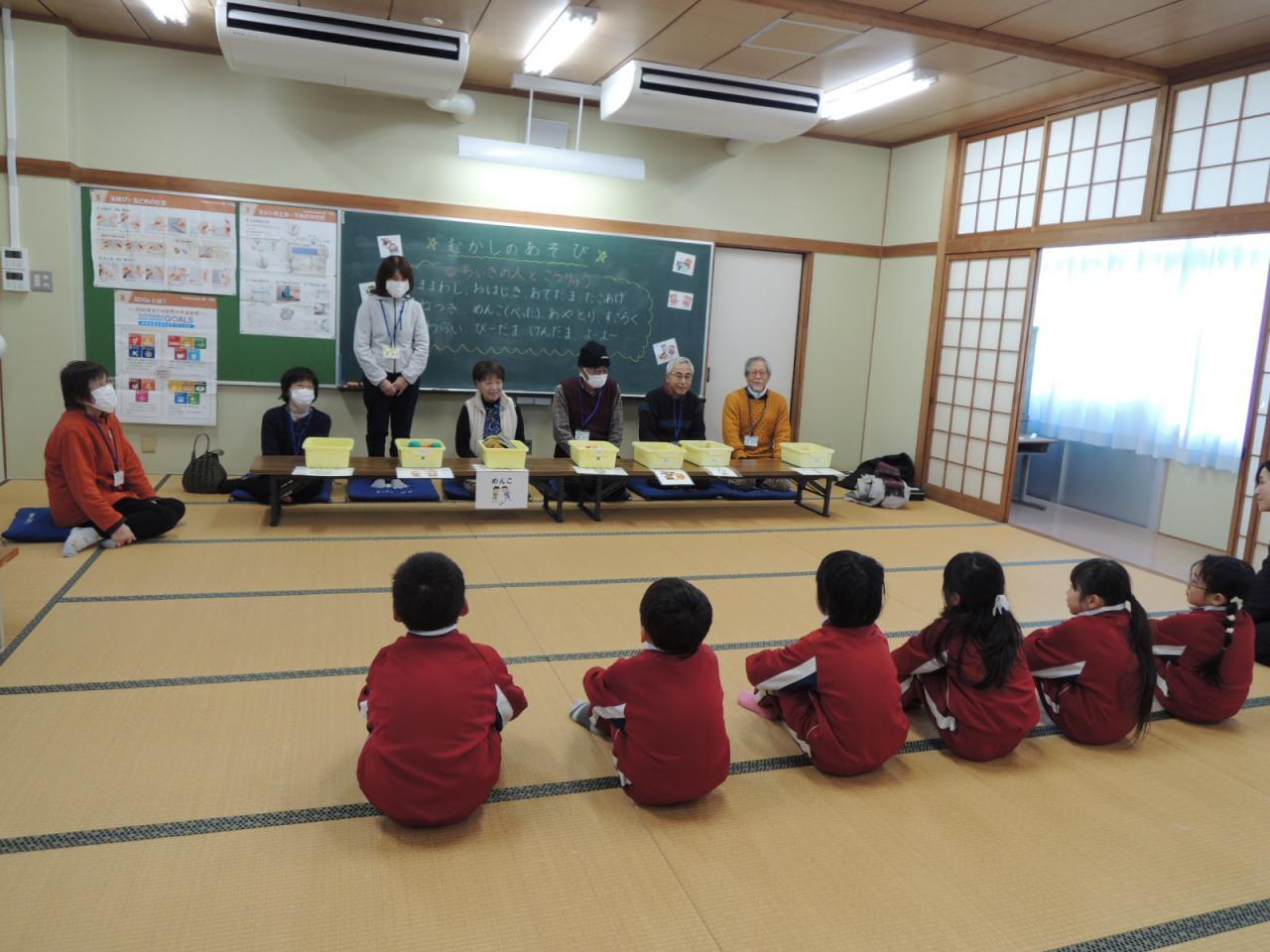 地域の方々に学校まで来ていただき、1年生が昔の遊びを教えてもらい、一緒に楽しみました。
