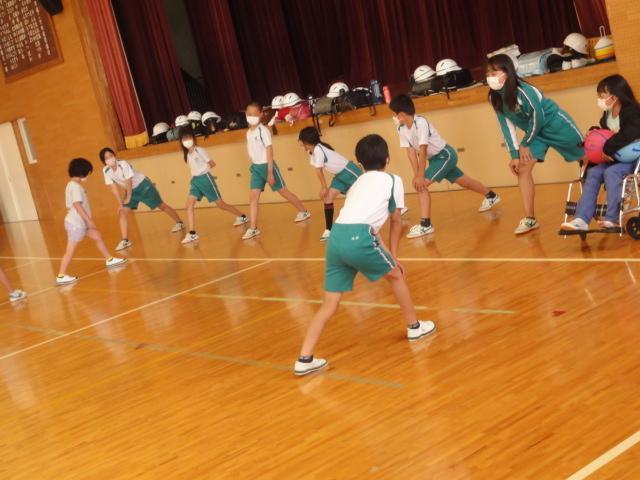 体育館では、6年生が中心となって準備体操から始まりました。迫力のドッヂボール!こわっ~と感じるスピード感。下級生にはお手柔らかにお願いします。