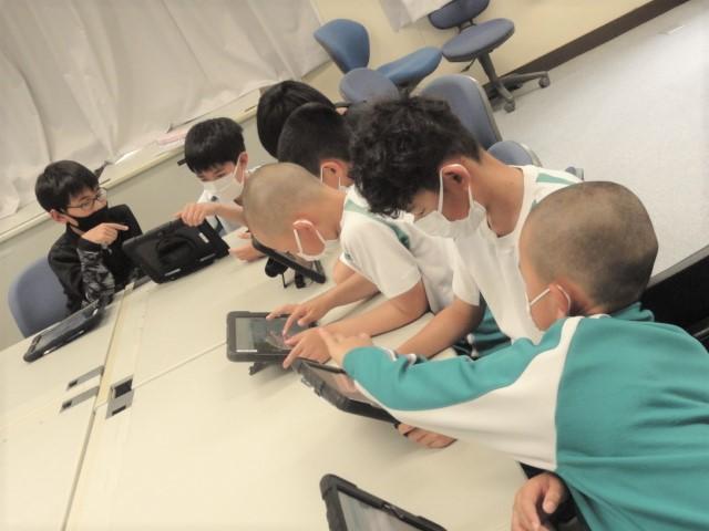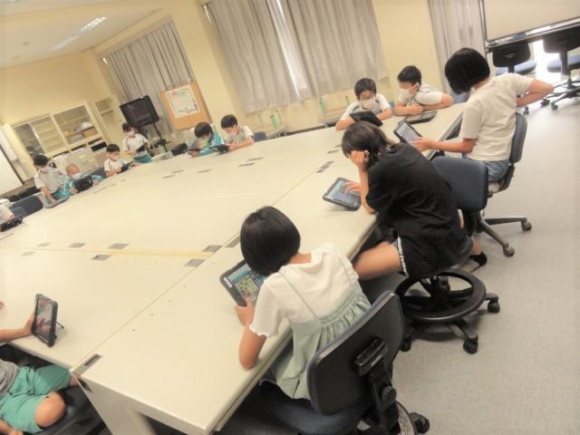 会議室となった旧コンピュータ室では、自分のタブレットを使って「ゲームを通じたプログラミング」に取り組んでいました。教えあいの光景も見られました。
