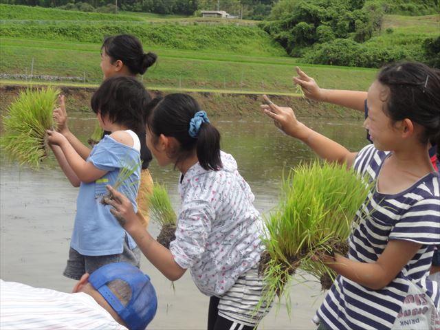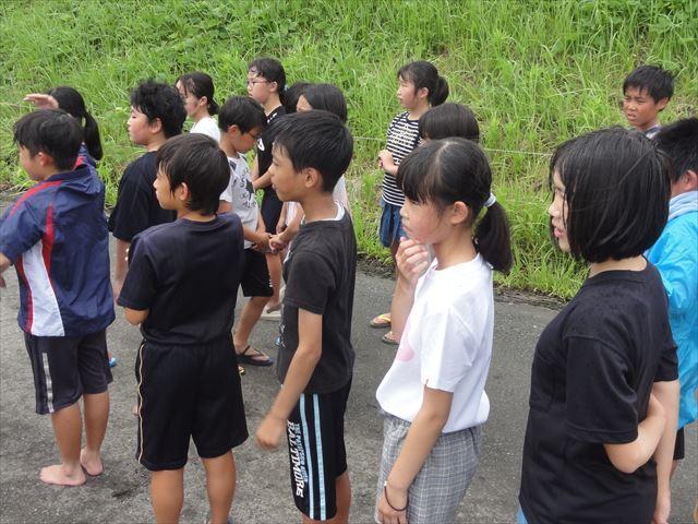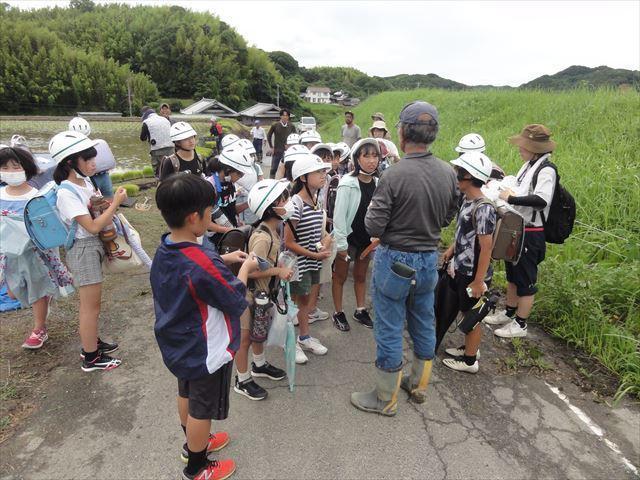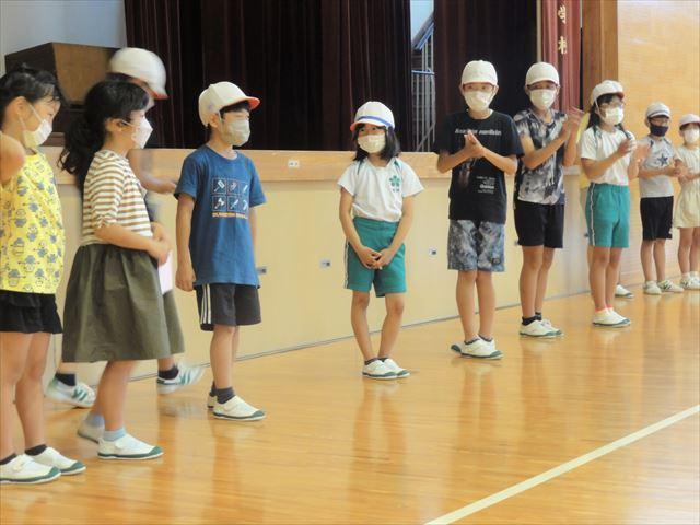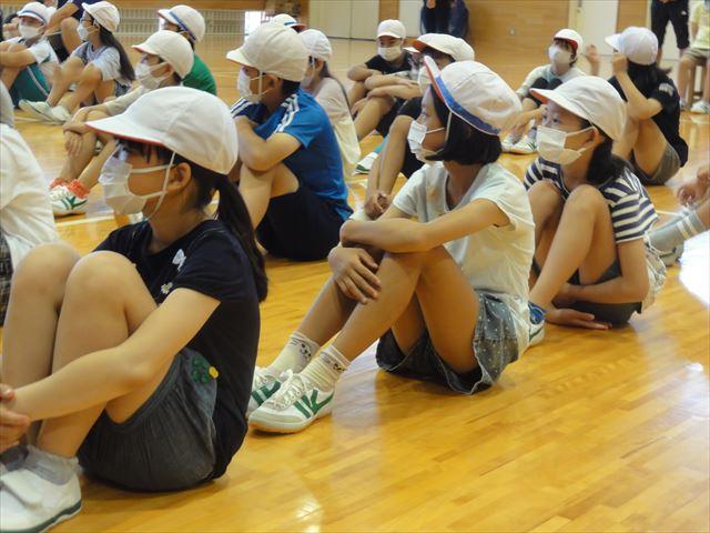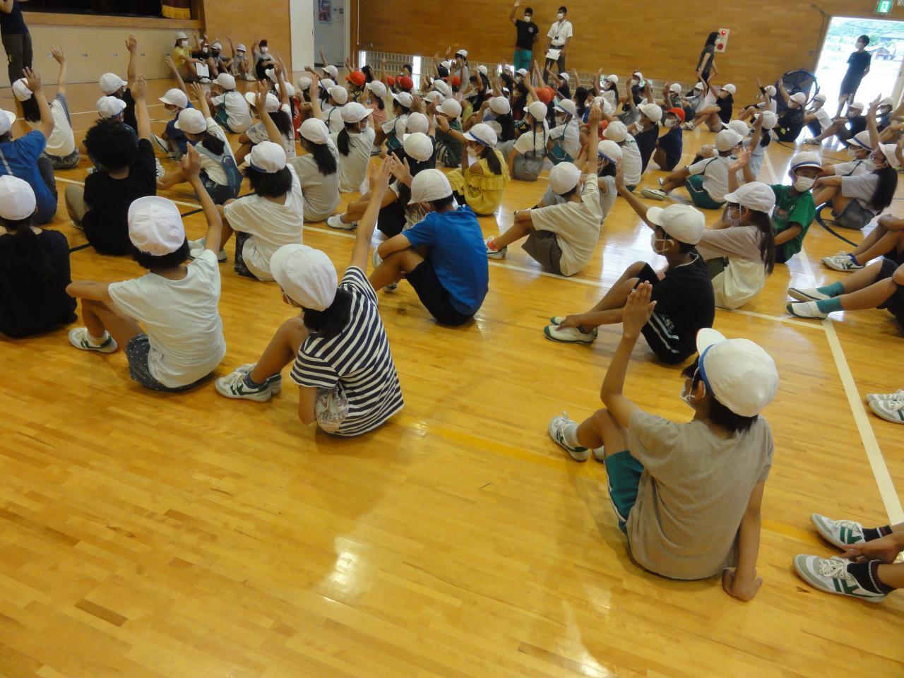 今朝の児童朝会、「熱中症クイズ」(お子様の伝える力!のために、お子様からお話を聞いてあげてください。)を楽しんでいる子どもたち、そして『田植え中』の子どもたちをお届けします。