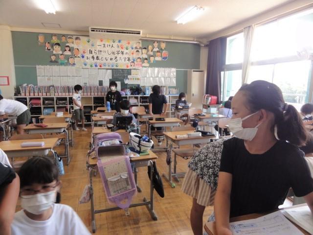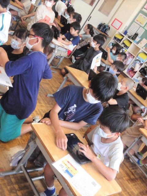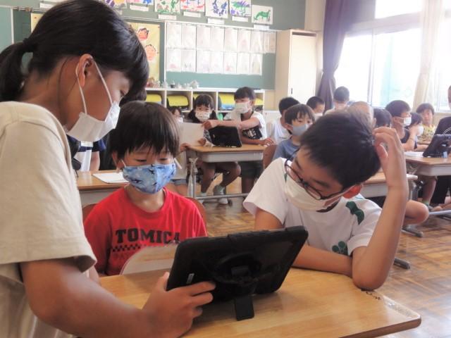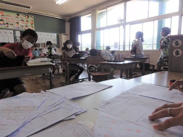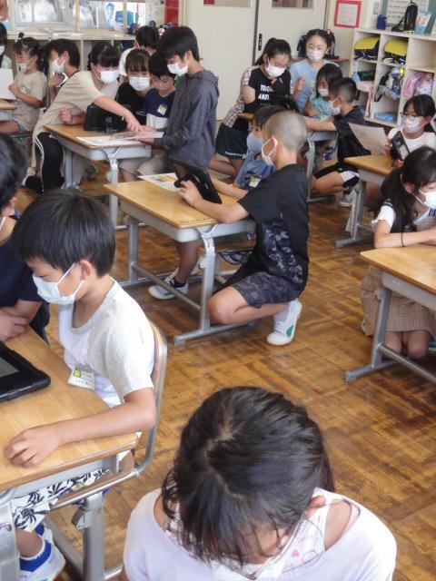 4年生は、寸暇を惜しんで提出されたプリントの採点中をカシャ📸、3年生は憩いのひと時を思い思いに過ごす様子をカシャ📸、6年生は1年生のタブレット設定を手伝う様子をカシャ📸、5年生は、提出物をキチンと並べ終えたところでした、着座したわたしを囲むみんなをカシャ📸。2年生は昨日たっぷりお伝えしたので・・・。