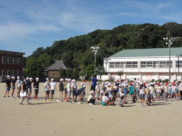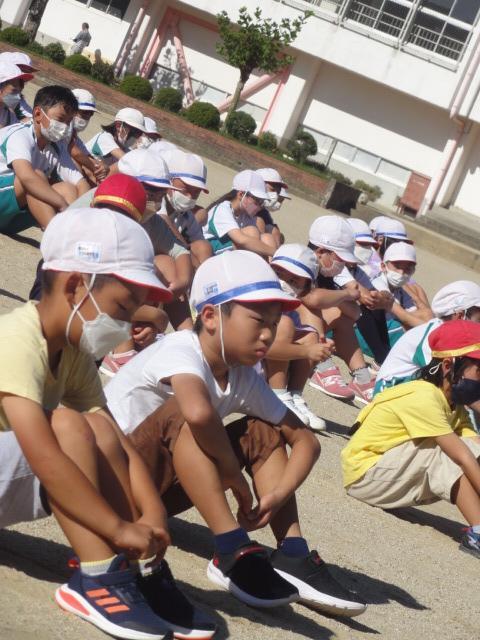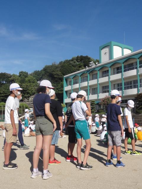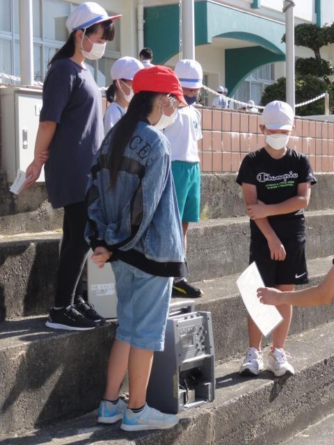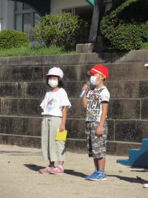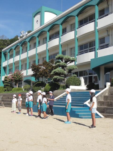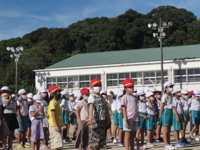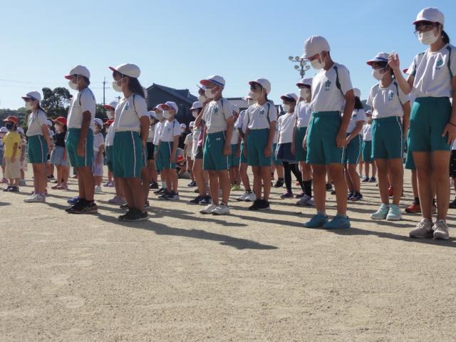ギラギラからは少し和らいだ感のある朝陽を浴びつつ運動場で児童朝会がありました。本日の担当教員から『〇〇の秋』(〇の時数制限はなし)とのフリップボードが掲げられました。