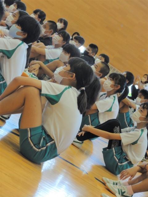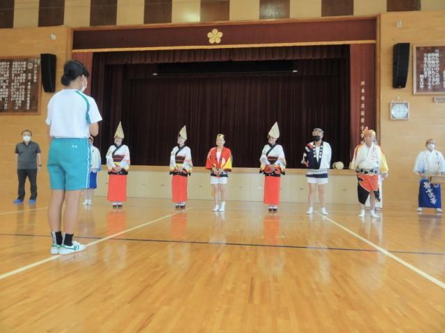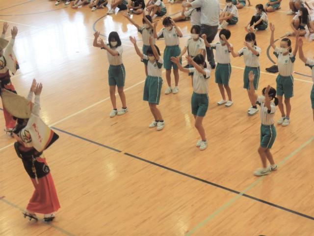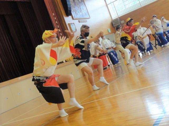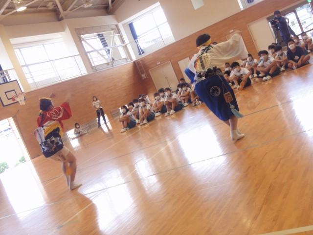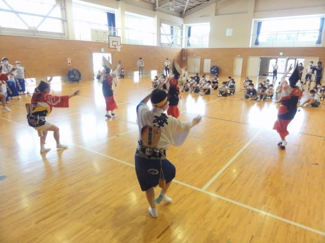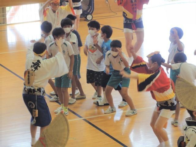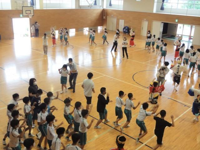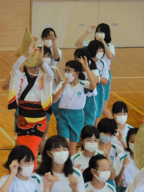 さて、金曜日の四時間目。5、6年生はストリートダンスの関連事業で「地域の伝統芸能」に触れる時間となり、洲本市内の「連」の方々に体育館で阿波踊りを披露いただくとともに、子どもたちとともに踊っていただきました。恥ずかしそうに戸惑いを見せていた子どもたちも、鉦や太鼓の音色に乗せられて、笑顔あふれる、そして熱気もあふれる時間を過ごしました。体育館では、焼きそばやイカ焼きの香りが、鼻をくすぐったように感じました。(笑)