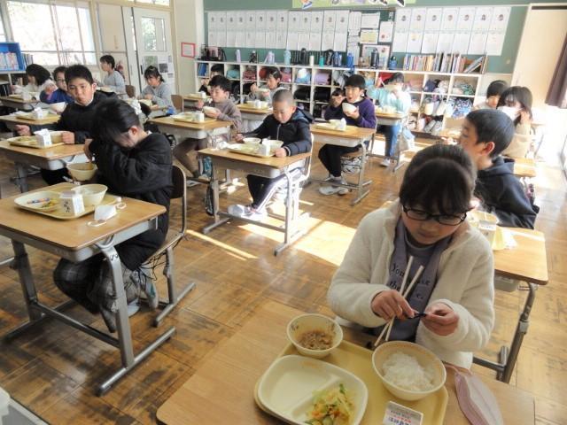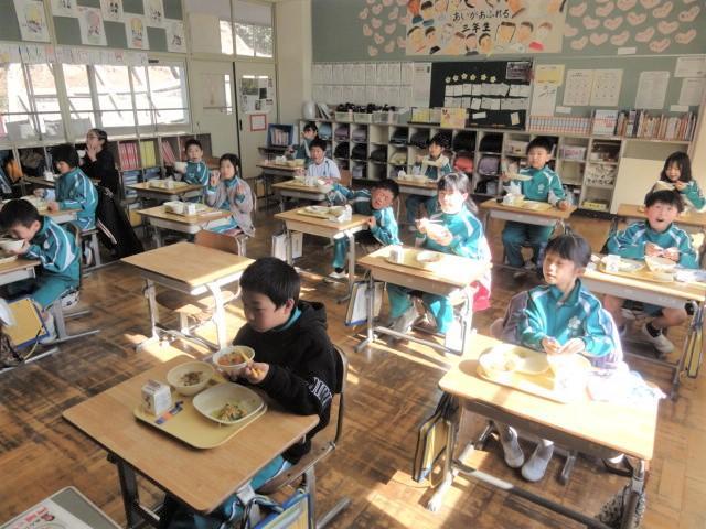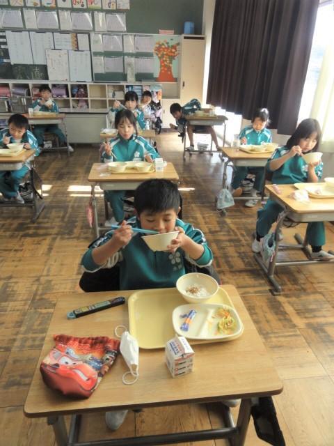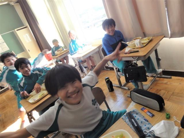 1年生の給食サポート後、直ちに他の学年へと急行しました。大きな声で!という状況はありませんが、教職員もそして児童も、『黙食』を少し意識しつつも---、という状況になっています。タイトルのように、みんなで机を寄せ合って他愛もない話にニコニコしながら、パクパクする光景が復活する日を期待しています。