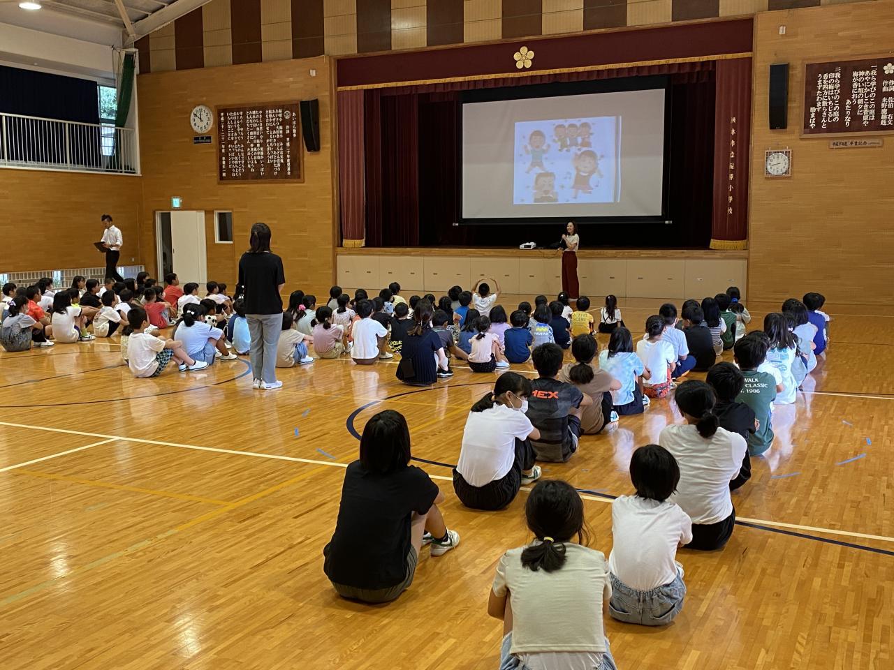 始業式の校長先生のお話では、夏休みにプールや天神さんのお祭り、すがわら塾の行事など、校長先生も参加してのお話、みんなの成長を支えてくださってる方がたくさんおられること、また、地域の行事にこれからも参加してください。そして、行事の多い2学期、目標やめあてを持って取り組みましょうと、お話がありました。