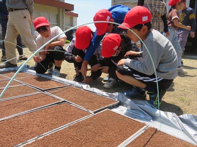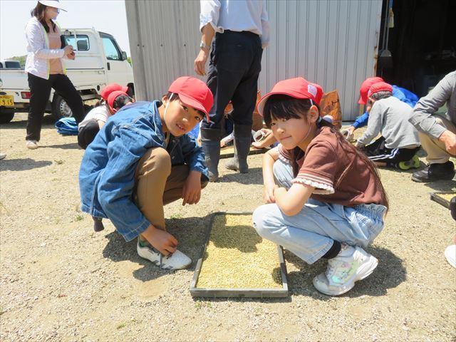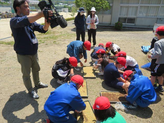 5/11(木)に令和5年度の米づくりが始まりました。3年生と5年生は、もみまきを体験しました。今日は、淡路島TVの取材もありました。