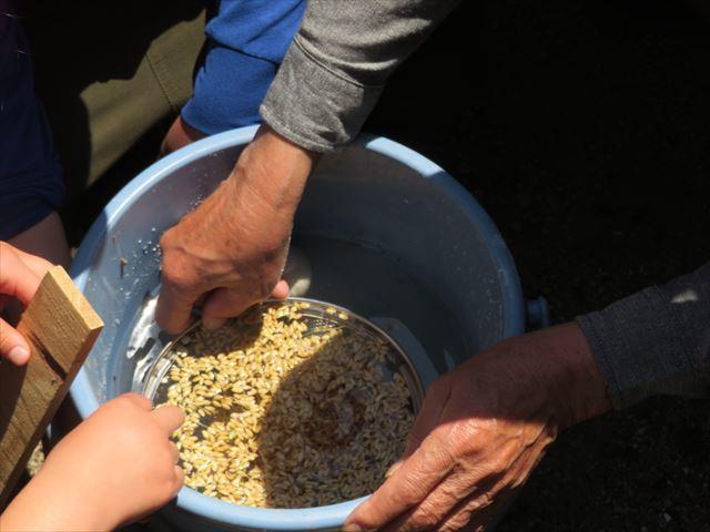 塩水選では、水の中に沈んでいた生卵が、たくさん塩を入れていくことでうかんでいくる様子に驚いていました。この方法で、軽いもみを取り除き、しっかりつまったもみを選んでいくという、昔の人の知恵を学びました。もみまきを済ませた後、苗床をつくる様子を見学させていただきました。