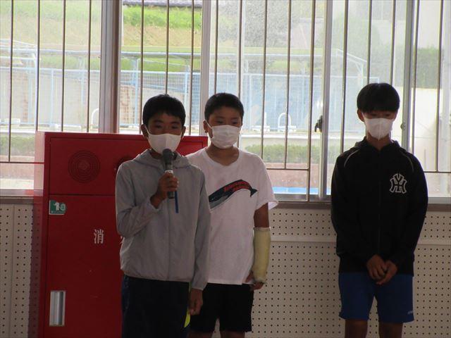 冒頭、前期の児童会役員の3人から全校生へあいさつがありました。そのあと、後期の役員がバトンを受け継ぐということで、あいさつをしました。