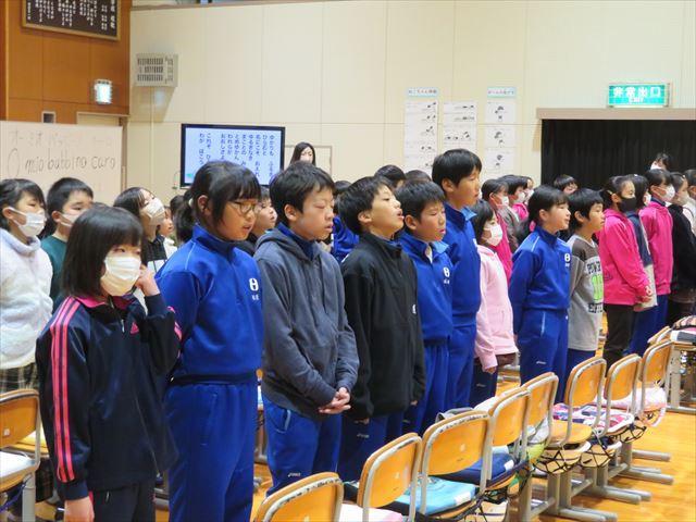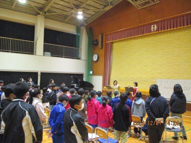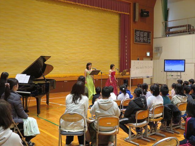 午後は、ベルフィオーレ様をお招きして、コンサートでした。きれいな歌声と、歌声の出し方レッスンなどプログラムを工夫していただきました。最後に広石小学校の校歌を会場全体で合唱したのはステキな時間になりました。