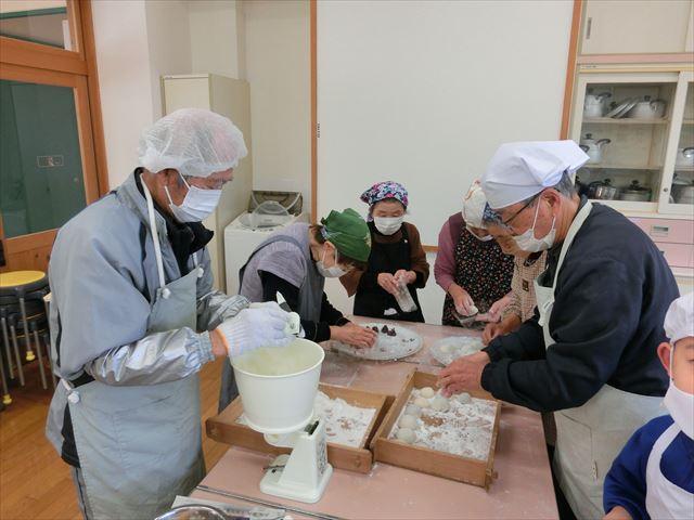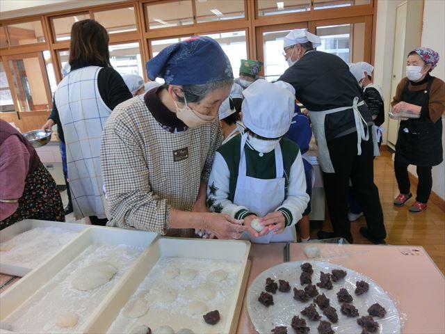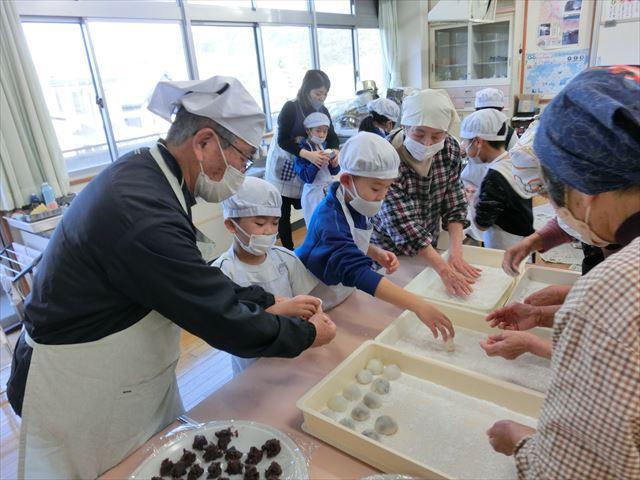 おもちづくりでは、モチ米を蒸してモチにつき、あんこを包む作業をさせていただきました。モチを丸める作業が初めての子もいて、楽しく体験しました。