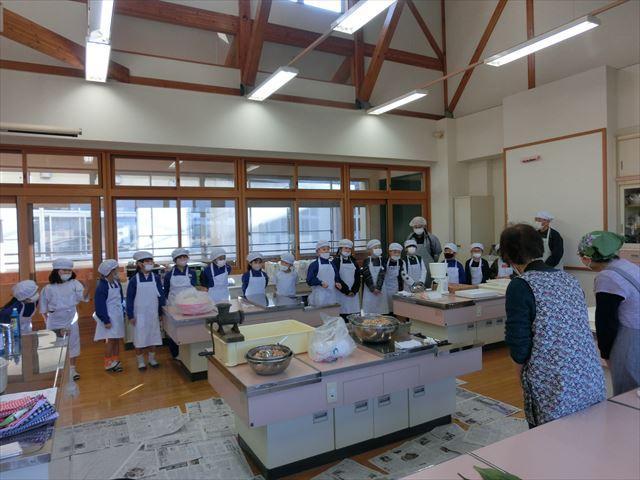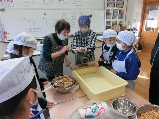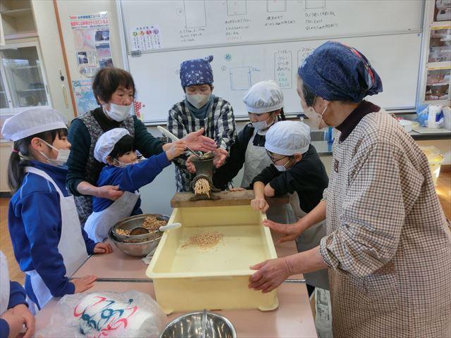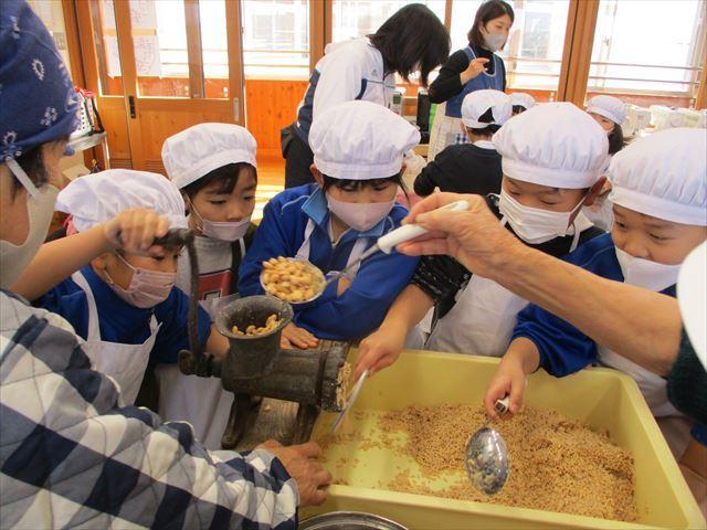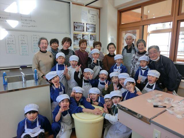今日は1、2年生が、広石のおじいちゃんおばあちゃんをお招きして、一緒にお味噌づくりを体験しました。お年寄りの方は何度も相談を重ねて下さり、お餅づくりも体験させてくださいました。