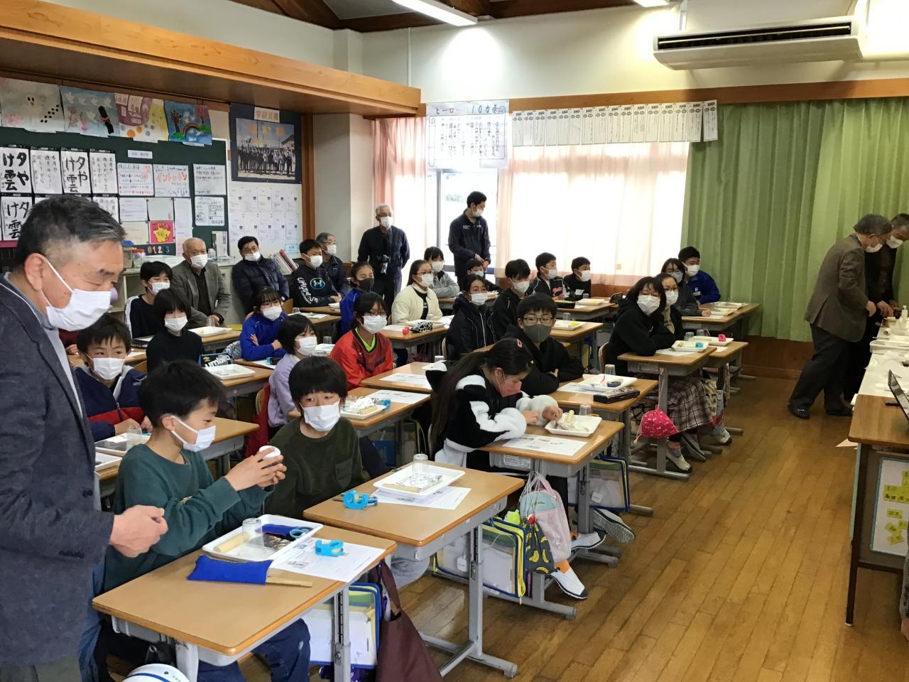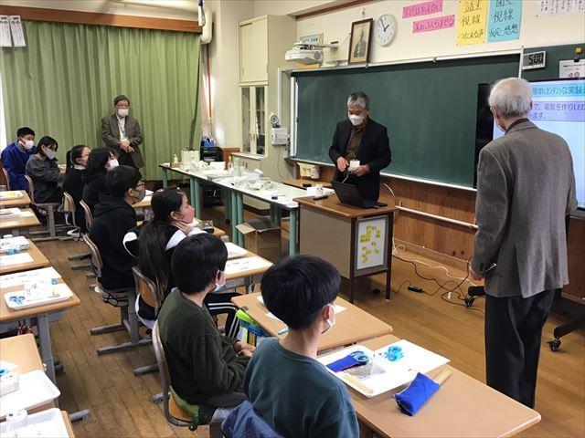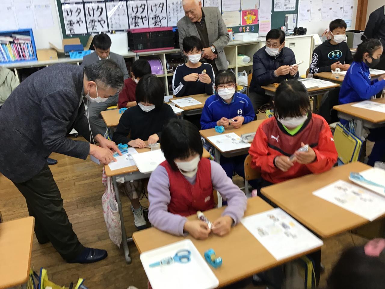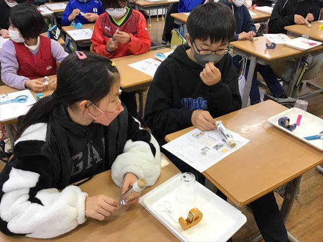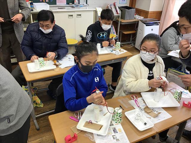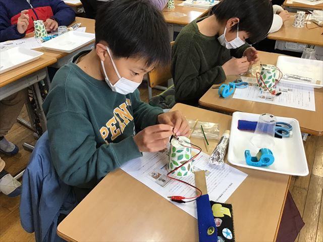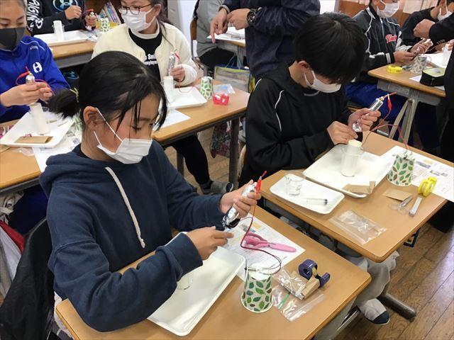 いざ製作が始まると、指示を聞きながら隣の子と相談したり、大人の人のサポートを受けたりして電池づくりに集中していました。最後に活性炭電池にプロペラをとりつけたとき、「うわあ、回った!」「動いた!」と教室のあちこちから驚きと達成感を感じる声が聞こえました。6年生代表のあいさつでも、プロペラが回ったことを嬉しかったと伝えていました。