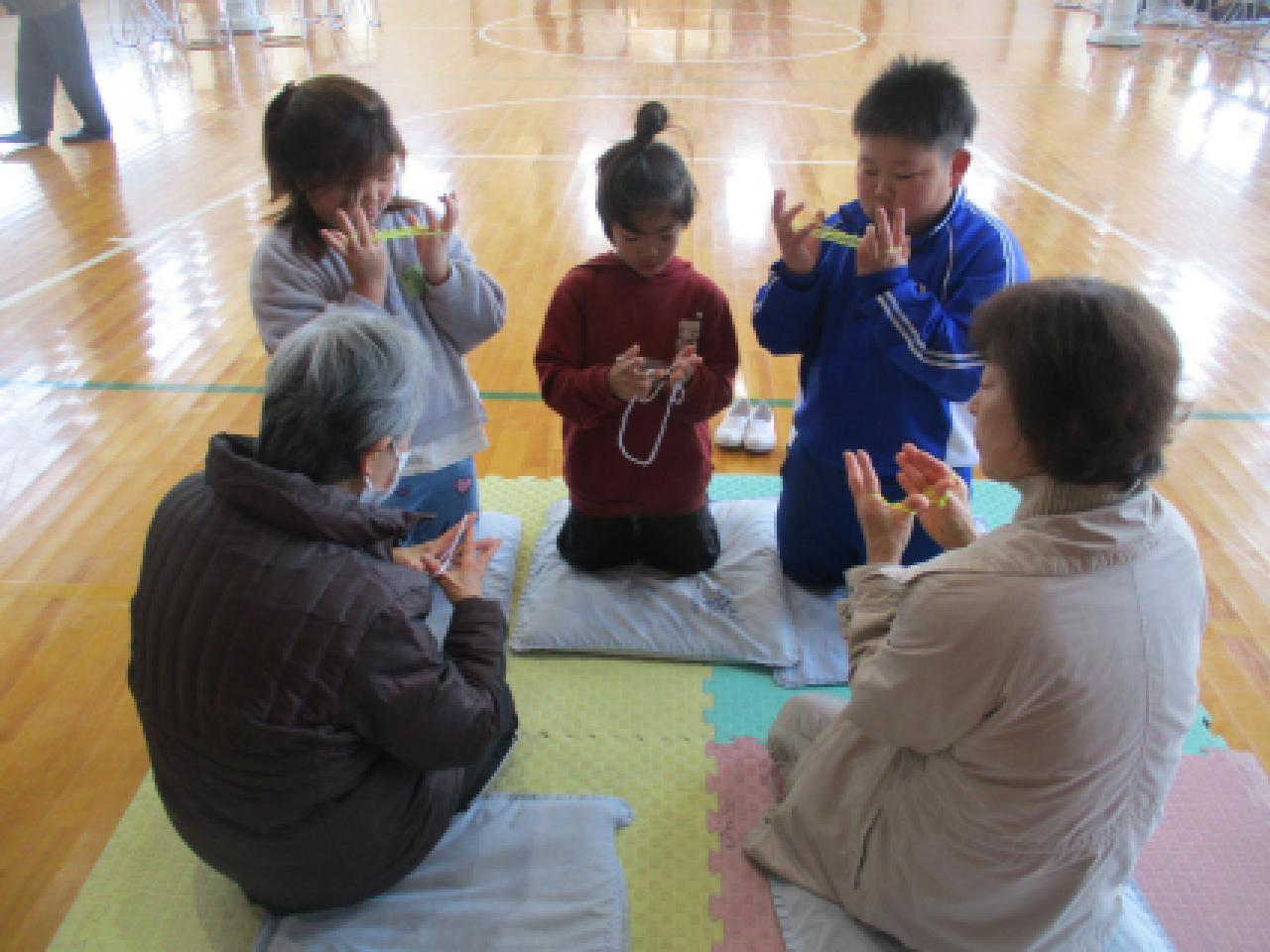 1・2年生が、地域のお年寄りの皆様をお迎えし、昔の遊びを教えていただきました。けん玉やこま回しなど、初めて経験する遊びに目を輝かせながら何度も挑戦する子どもたち。できるようになった瞬間には、「やった!」と友達と顔を見合わせ、喜び合う微笑ましい姿があちらこちらで見られました。