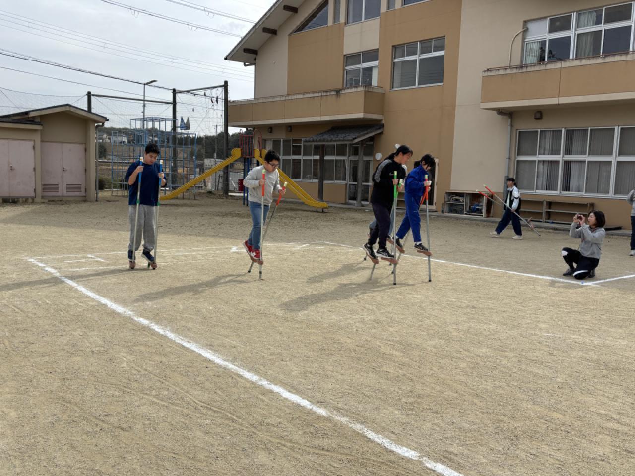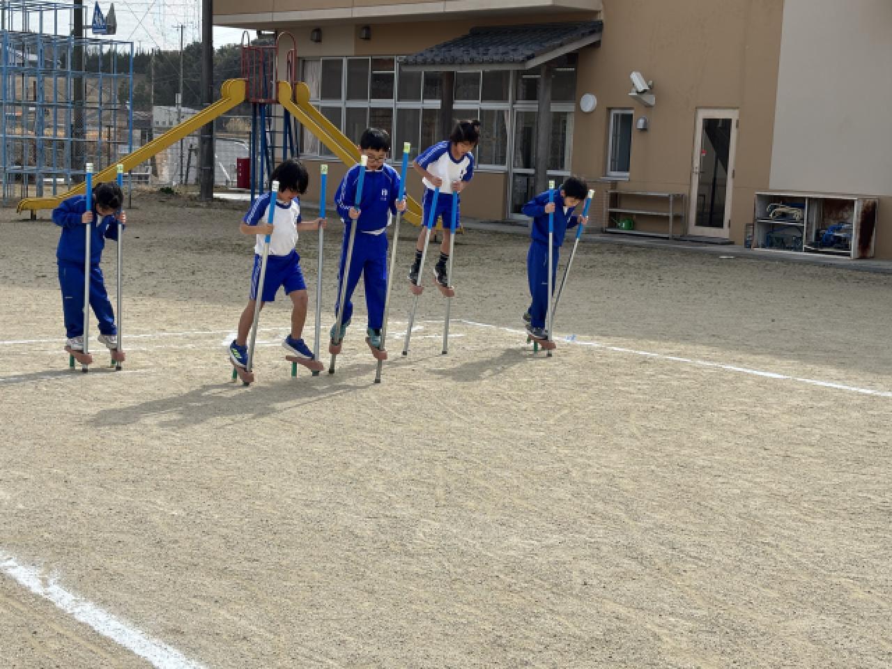 本校恒例の竹馬大会を、今年も学年ごとに実施しました。子どもたちはこれまでの練習の成果を発揮しようと、真剣な表情で競技に臨みました。初めは苦戦していた児童も、繰り返し練習を重ねる中で着実に上達し、本番では堂々とした姿を見せてくれました。