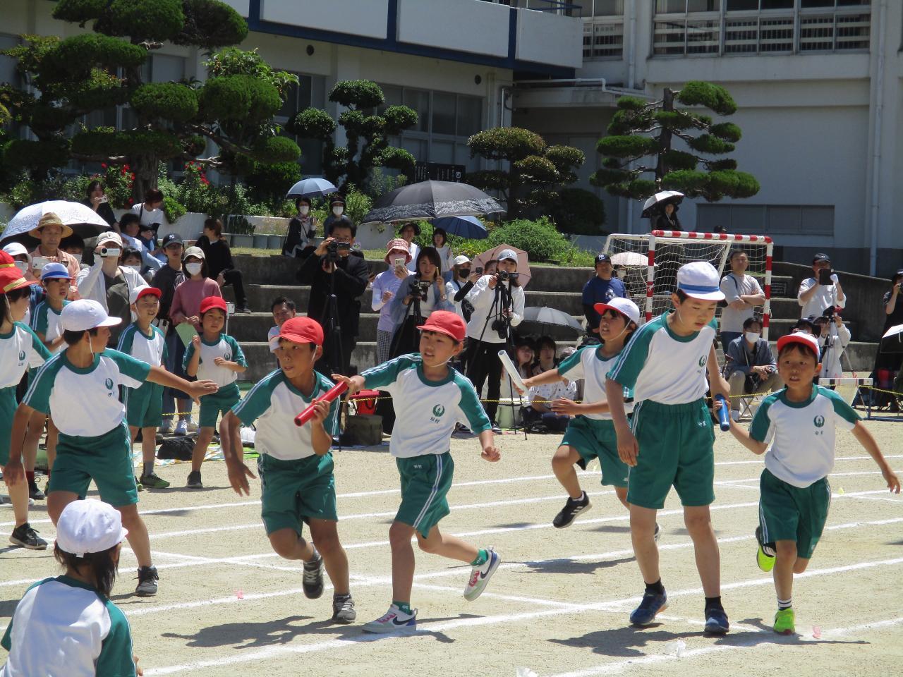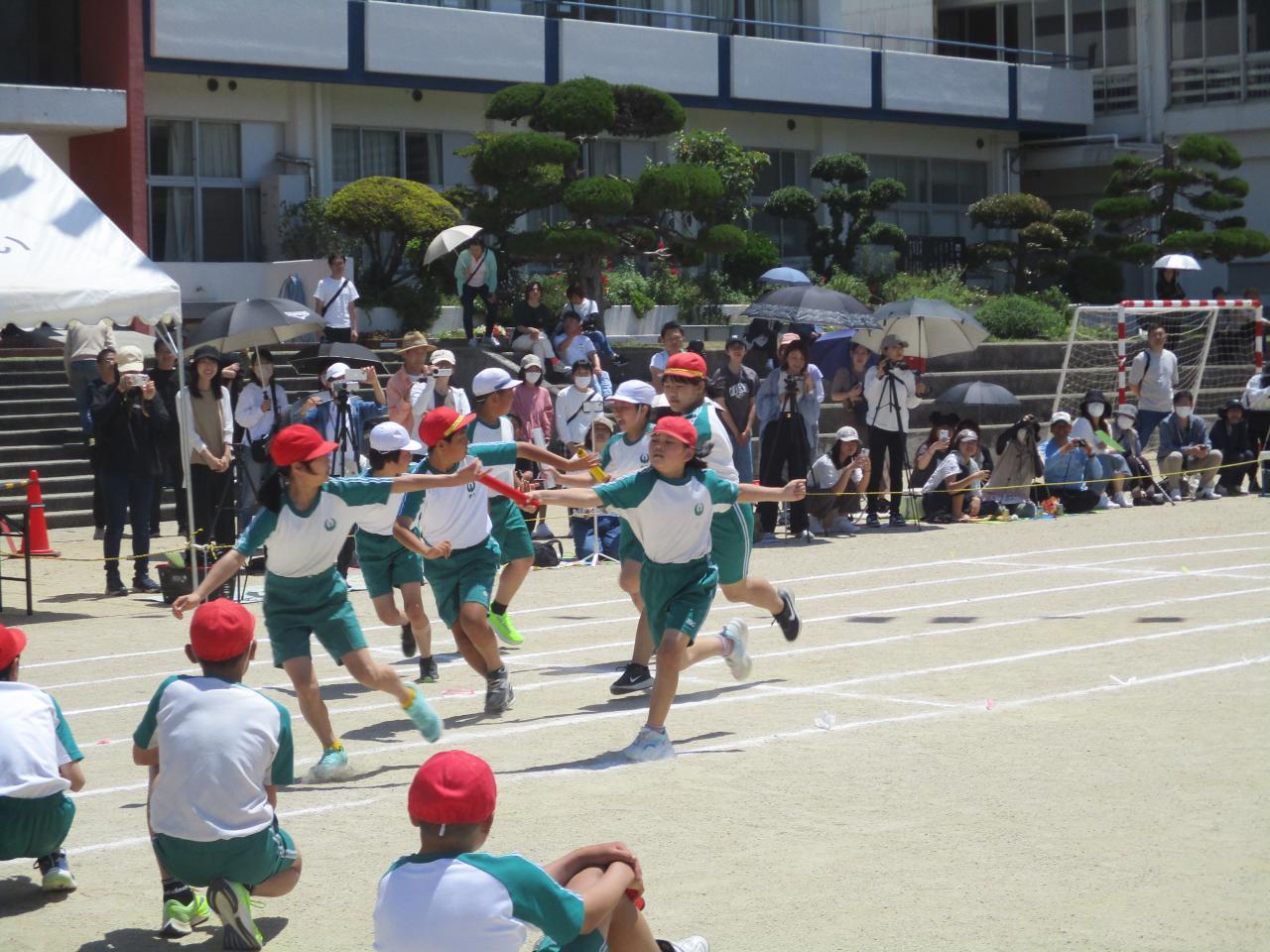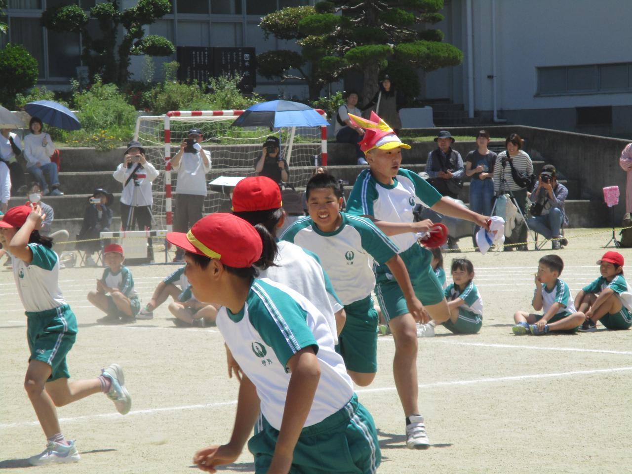 5月25日(土)に、運動会を実施しました。当日は、天候にも恵まれ、子どもたちは元気いっぱいに演技をすることができました。ご家族の方や地域の方々、多くの皆様にご観覧いただく中で、テーマ「過去の自分を越えていけ 気合だ 笑顔だ 全力だ」の通り、力を発揮できました。