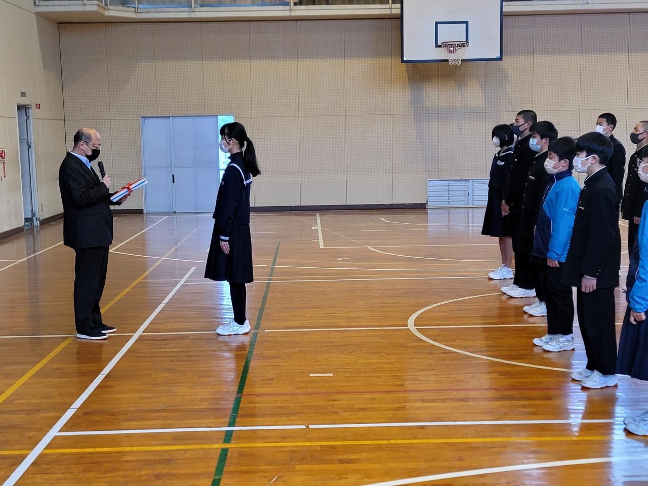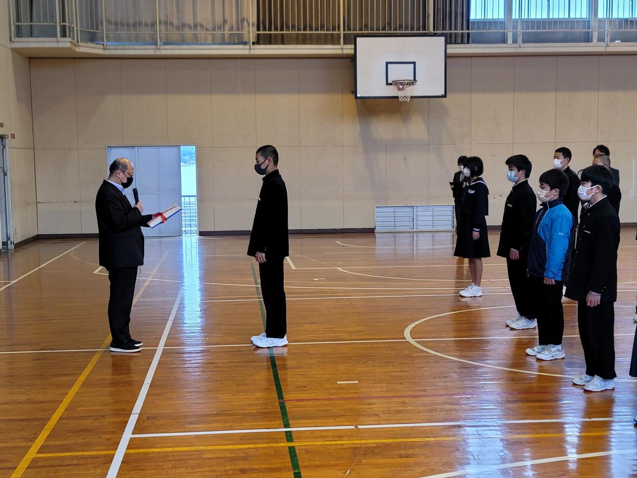 本日、3月24日(金)、修業式が行われました。校長先生より各学年の代表に修了証がわたされました。この後、校長先生より「この節目に、学校や全体だけでなく、それぞれがプラスになるようにしてください。また、4月から学校での感染症対策が変わります。詳しくは本日市教育委員会よりあんしんネットで配信されますので、家の人と見てください。マスクの着用については基本的に個人の判断となります。着ける着けないで人を差別することのないようにしましょう。」生徒指導担当からは「自転車の乗り方に気を付けよう」という話と「先輩としての行動ができるようにしましょう」という話がありました。