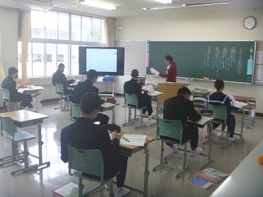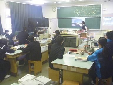 2年生は、理科です。「光の屈折」についての学習です。「入射角」や「反射」についての説明を受け、光ファイバーの仕組みについても学んでいます。