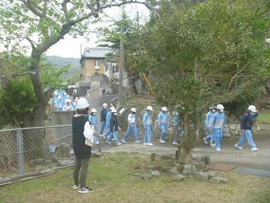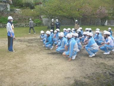 今回は、「緊急地震速報により南海トラフ地震が発生し、津波のおそれがある」との想定で、避難訓練を行いました。地震発生の放送と同時に、全校生は机の下に隠れて待機しました。その後、指示に従ってヘルメットを着用し、津波から逃れるためにさくら公園へ移動しました。