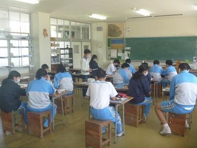 昨日から黄砂が日本列島に押し寄せています。今朝、校舎から沖合を見ると、目の前にある成ヶ島でさえ少し霞んでいるような気がします。沖合にある友が島は完全に霞んでいて、辛うじてシルエットだけが見える程度となっています。黄砂は花粉と同様にアレルギーを引き起こすので、マスクの着用するなど注意が必要です。では、今日の由良中生の様子です。