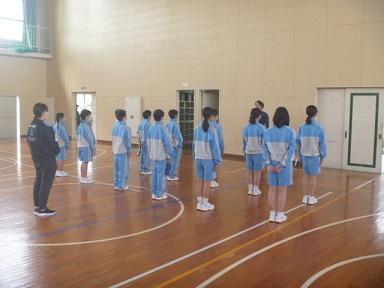 1年生は、体育です。集団行動の学習です。写真は、あいさつと礼の仕方を練習しているところです。体育の授業は2回目ですが、1年生は元気な表情で楽しく活動しています。